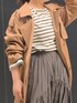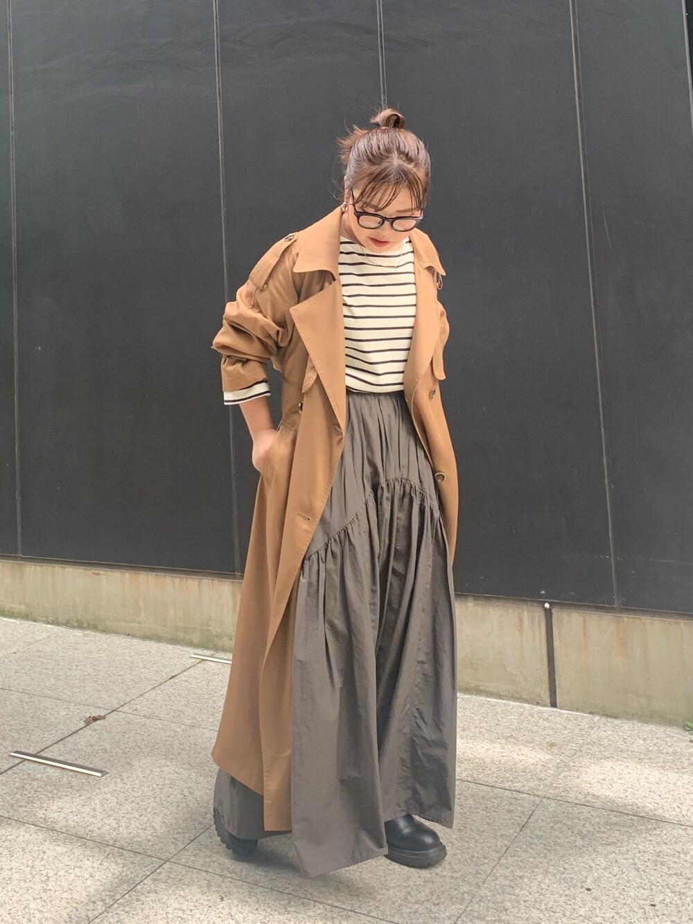 【美術館デートコーデ🖌】 《コート》 トレンチコートはお仕事だったり、大人の方しか使えないと思っていた私が着てみて驚いたコートです!笑 ルーズなシルエットでカジュアルにも合わせられるではありませんか👀✨ サイズはS,M展開なのでお好みのサイズをお選び頂けます◎(Sサイズ着用) とろみのある生地感なので落ち感もしっかり出ますし、後ろには羽が付いているので小柄もスタイルアップになりますよ😉 今から春先にも使えるこちらのコート皆様いかがでしょうか💭 《トップス》 トレンチコートにボーダーって最強すぎませんか?💦 今回はスカートにインして着用してますが、出したままだとお尻に被さる丈感です!サイドにスリットが入っているので出したままでも動きが出てこなれ感が出せちゃいます🙆🏻♀️ ゆったりとしたサイズ感なのでとても楽チンでした🎊 《スカート》 私の大好きなギャザースカート!! 広がり気になりませんか?とお客様から質問いただくことが多いのですがこちらのスカートはギャザーが前から後ろに落ちてくデザインなので広がりは全く気になりません😆 ウエストは後ろがゴムになっているので、着脱もすんなりです! 150cm以下の身長の方はひと捲りして履いても◎ どんな洋服にも合わせられるので、年中履いてるお気に入りの1着です❤️🔥