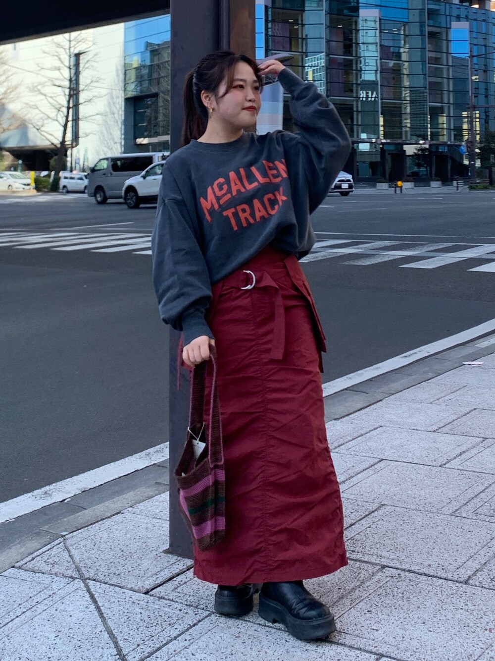 【カラーミリタリーコーデ🥀】 《スウェット》 何枚持ってても損なしなスウェット! 裾のリブがしっかりしているのでどんなコーデにも取り入れやすい丈感です◎ ロゴは正面にだけ入っているシンプルなデザインです! チャコールグレーはメンズライクな印象もありますが、スカート合わせで女性らしくも合わせられますよ😉 《スカート》 他にはなかなかないポケットデザインスカート! ウエスト部分についているポケットはベルトのようになっているので、取り外しも可能です🙆🏻♀️ 151cmですが、フラットな靴でも引きずらずに着用することが出来ました◎ シンプルなスウェットもデザイン性のあるボトムス合わせでこなれ感が出せちゃいます😏 《バッグ》 コーデのアクセントになるハンドバッグ👜 取手の部分が長めに作られており、肩にもかけることが出来ます! カジュアルなコーデに女性らしいハンドバッグを持つだけでおしゃれですよね😆