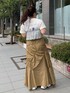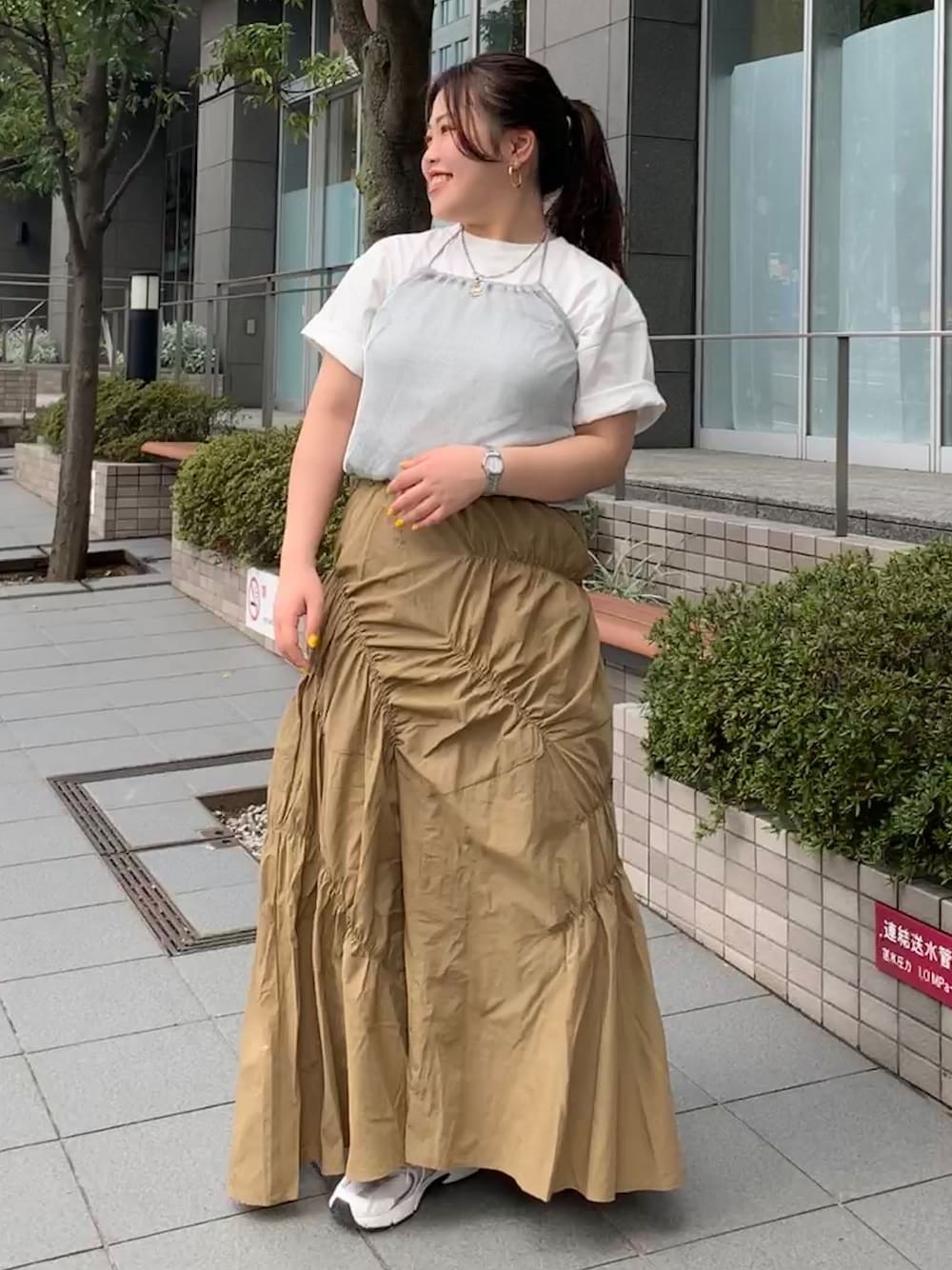 【トレンド満載コーデ🌼】 《Tシャツ》 長すぎず短すぎずな丈感なので、どんなコーデにも取り入れやすいアイテムです! ただ着るのではなく、お袖を少し捲ってあげるとよりこなれ感が出ますよ♡ 《ビスチェ》 今季トレンドのビスチェ‼️ 更にメタリックデザインというトレンドを取り入れたアイテムです✨ 首の後ろで結んで着用出来ます◎ カジュアルにロゴの入っているTシャツ合わせはもちろん、無地のTシャツに合わせてビスチェを主役にしてあげても🙆🏻♀️ 《スカート》 ランダムにギャザーが入っているアイテムは今季トレンドです☝️✨ ウエスト部分はゴムになっているので着脱もかなり楽に行えます◎ 生地も柔らかく落ち感が出てくれるので、広がらずにバランスの取りやすいアイテムです! 丈は少し長めなので、小柄さんはソールの厚いシューズとの合わせがおすすめです♪