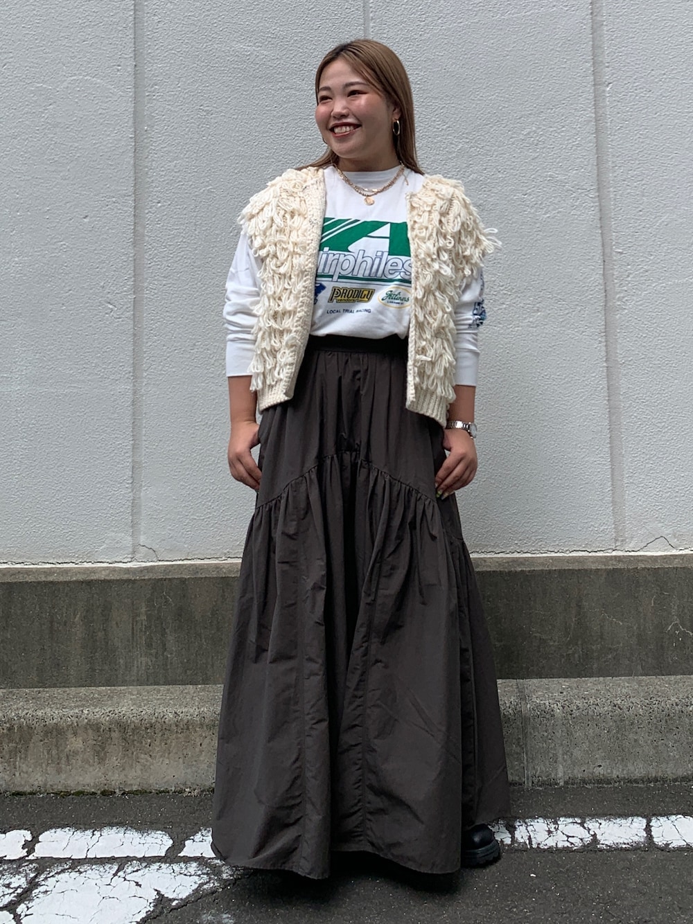 《ベスト》 予約から大人気なループヤーンニットベスト♡ 肩幅は広めで柔らかく、落ち感がある為肩幅が気になる方にもおすすめです! ボリューム感のあるデザインですが、短めの丈にすることでバランスが取りやすくなってます🤭 《カットソー》 ロゴがアクセントなロングスリーブTee! 腕にもロゴが入っているので、ベストなどを重ねた時にもチラッと見えるのが可愛い♡ 《スカート》 ウエストは後ろがゴムになっているので、着脱も楽チンです🙆🏻♀️ 丈感は長めなので、小柄さんはひとまくりしても◎