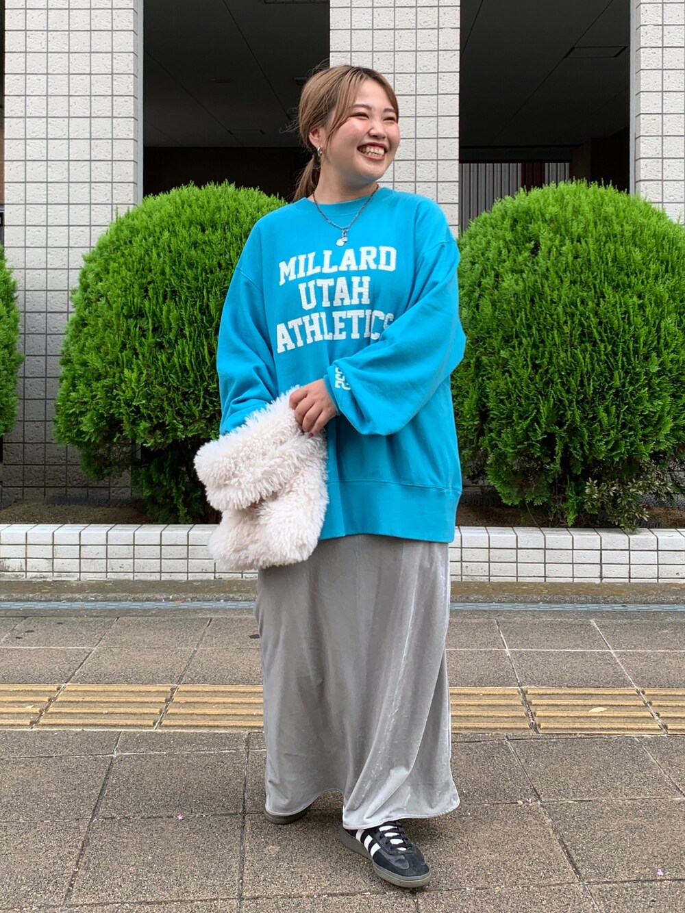《スウェット》 毎年大人気のビッグシルエットロゴスウェット‼️ 今年はこのターコイズブルーがおすすめ🐬 袖と後ろにもロゴが入っててどこから見ても可愛い♡ お尻まで隠れる丈感なので、腰回りやお尻が気になる方にもおすすめです! 《スカート》 去年大好評だったベロアスカートが今年も登場しました! 伸縮性もあり履き心地も抜群です! Mサイズを着用しておりますが、少し長めなので小柄な方はSサイズがおすすめです! 《バッグ》 今年トレンドのファー素材のハンドバッグ👜 クラッチ風にもお使いいただけるので、コーデの雰囲気によって変えることができます◎