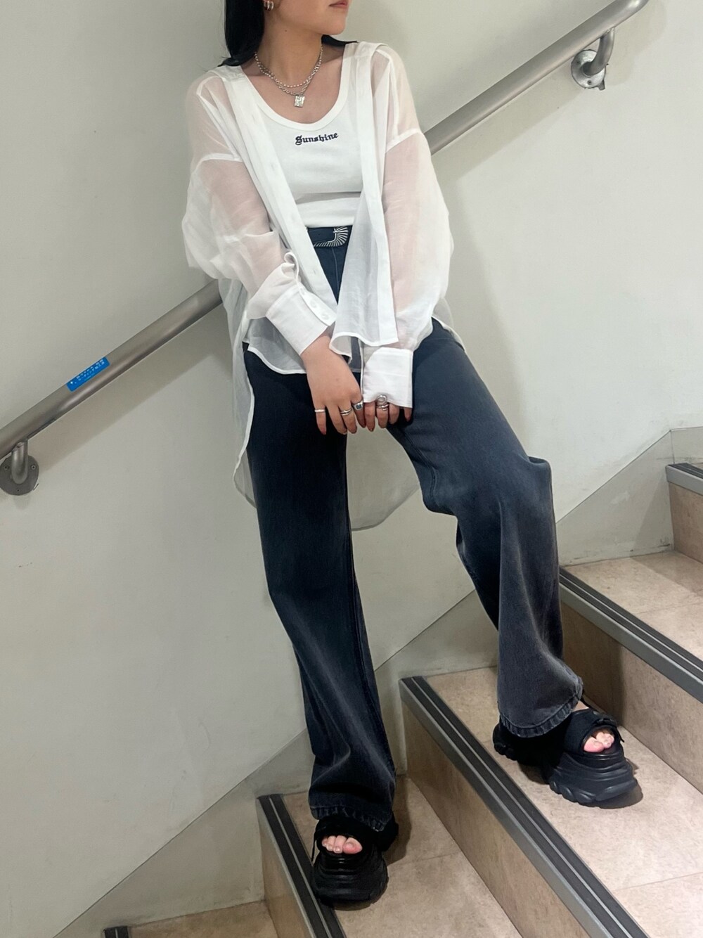 【トップス】胸元にロゴが入ったシンプルなタンクトップです。気温変動が激しくお洋服選びが難しいこの季節にシャツと合わせて使うととっても便利です。丈感は154センチでハイウェストのボトムスと合わせてピッタリで着用していただけます。 【ボトムス】大人気の後ろにダメージの入ったデニムです。デザインが可愛いのはもちろんですが。ハイウェストでスタイルアップ効果抜群のデニムです。丈感は154センチで厚底8センチ合わせてピッタリくらいの丈感です。