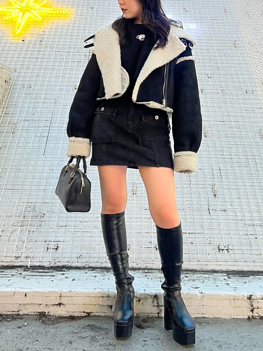 〜冬のモノトーンコーデ〜 【アウター】去年から大人気のショートボアブルゾンです。軽いですがとても暖かく裾の表面にボアが付いていないのでかっこいいブラックコーデにも取り入れやすいアウターです。 【スカート】カーゴポケットがついたトレンドど真ん中のスカートです。インナーパンツがついているのでミニスカート苦手な方でも挑戦しやすくなっています。 【トップス】切りっぱなしの裾がかわいいクロップド丈のトレーナーです。デザインは首元のロゴのみなので可愛らしいスカートからカジュアルなパンツまで着回しして頂けます。 【ブーツ】ヒール12センチ、ストレッチたっぷりでスタイルアップ効果抜群のブーツです。フロント部分も厚底なので、高低差が少なく疲れ知らずで履いていただけます。幅がやや狭めなので23.5センチでLサイズ着用です。 【バッグ】大人気のボストンバッグの再入荷です。シンプルなデザインとペットボトル余裕ではいるくらいの大きさで季節、コーデ、系統問わず沢山使っていた抱けるアイテムです。