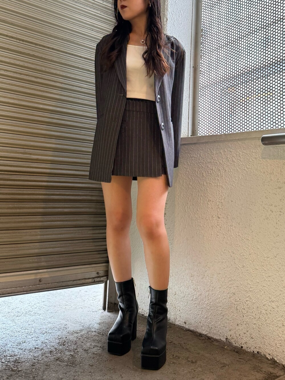〜秋の綺麗めセットアップコーデ〜 【ジャケット】ストライプのオーバーサイズジャケットです。切り返しなどなく、シンプルなデザインなので、カジュアルからフォーマルまで様々な場面でご着用いただけます。 【スカート】ジャケットとセットアップでご着用いただけるスカートです。ラップデザインが可愛くインナーショーツつきで機能性も抜群です。155センチでSサイズ着用です。 【トップス】スクエアネックでショート丈の秋に大活躍しそうなトップスです。カラーバリエーションも豊富で155センチでお臍ジャストくらいのちょうどいい丈感です。 【ブーツ】厚底のつま先がスクエア型のブーツです。フロント部分もしっかり厚底なので高低差なく安定してお履きいただけます。23.5センチでLサイズ着用です。