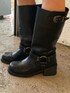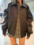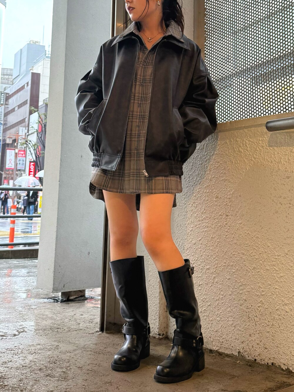 〜秋のヴィンテージライクコーデ〜 【アウター】EVRISで毎年秋に大人気のフェイクレザーブルゾンです。フェイクレザーなのでお天気問わずご着用頂けます。また、オーバーサイズですがギャザーが入っていて腰周りはスッキリ見えるお作りです。 【シャツ】ラメの糸が使われたチェックのシャツです。オーバーサイズですが 前が少し短め後ろが長めで切り返しなども無いので着回ししやすいアイテムです。 【シューズ】今季トレンドのエンジニアブーツです。155cmで膝より5センチくらい下の丈感なので、低身長さんでも履きやすい長さになってます。23.5cmでMサイズでピッタリです。