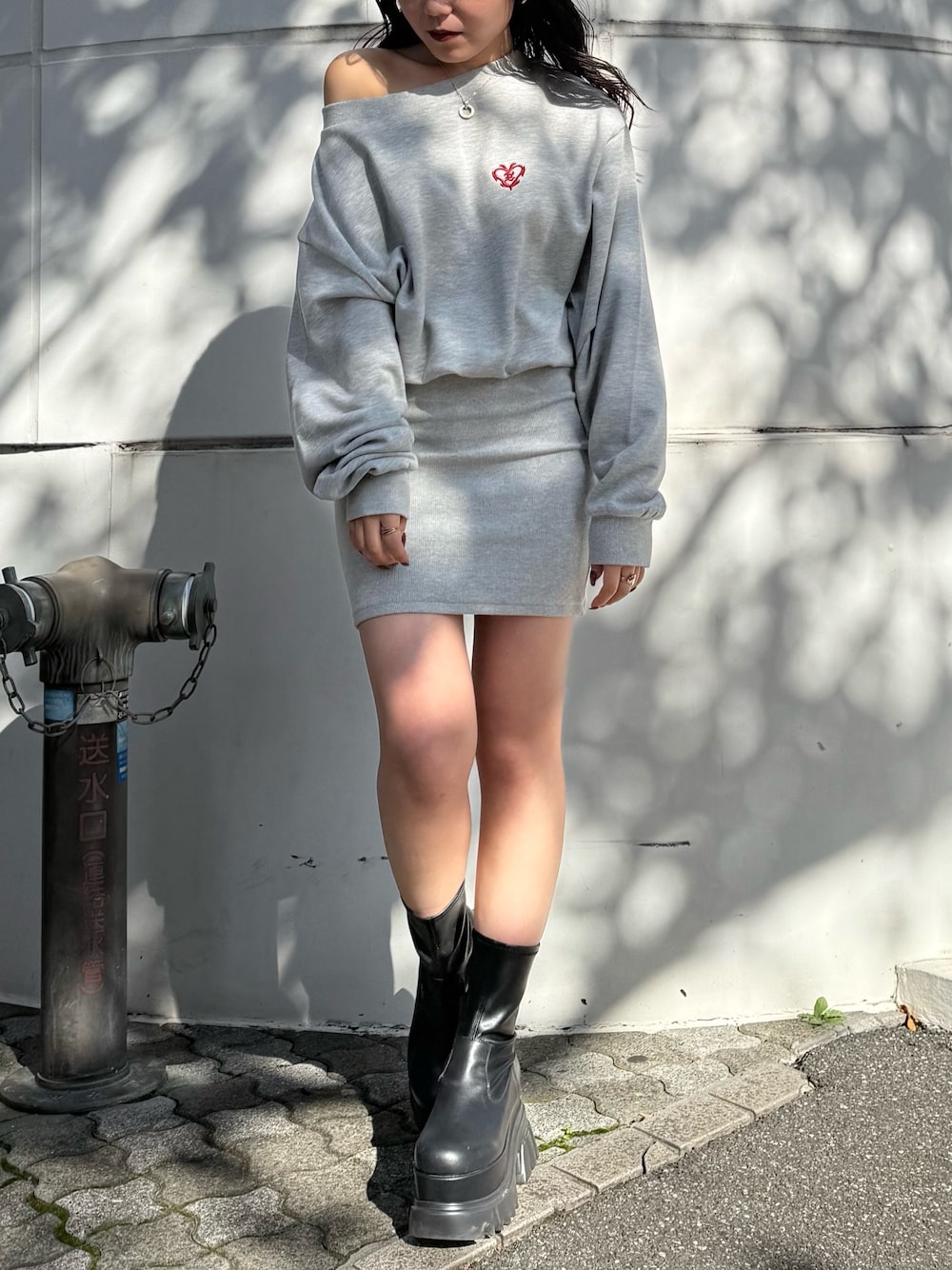 黒石夏帆(EVRIS)のワンピース「ワンポイントスウェットオフショルミニワンピース」を使ったコーディネート