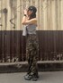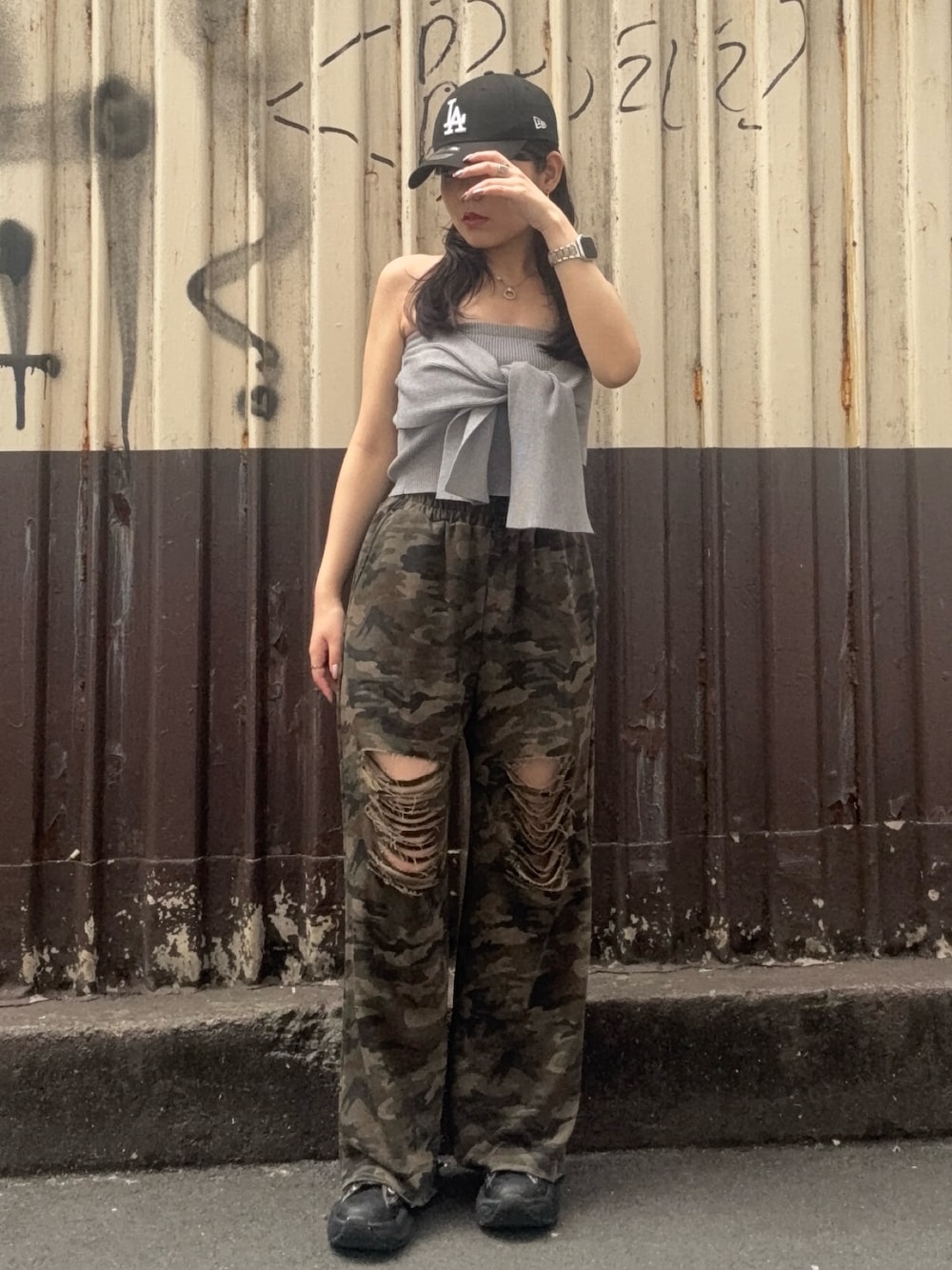 【トップス】EVRISで毎年人気のリボンデザインのニットビスチェです。ご自身で結ぶタイプなのでお好みの結び方で結んで頂けます。 【ボトムス】ダメージが入ったカモフラ柄のスウェットパンツです。 ダボッとしたデザインと後ろにもダメージが入っているのが可愛いです。155cmで4センチ位の厚底やヒールを履くと地面ピッタリくらいになる丈感です。