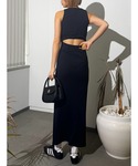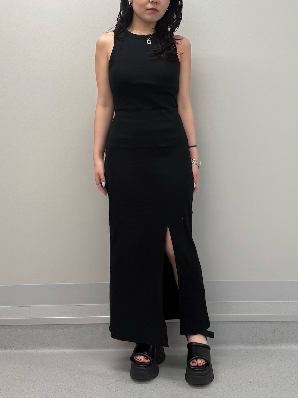 【ワンピース】背中があいたリブのワンピースです。カラーバリエーションが豊富で、ピタッとしすぎていないので、様々な方が着やすい作りになってます。足元にスリットも入ってるのでロングでも重く見えず、真夏にもご着用頂けます。 【シューズ】厚底のフラットサンダルです。高さ10cmでスタイルアップ効果抜群ですが、フロントも厚底なフラットタイプなので足への負担が少なく着用頂けます。23.5cmでMサイズ着用です。