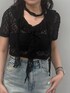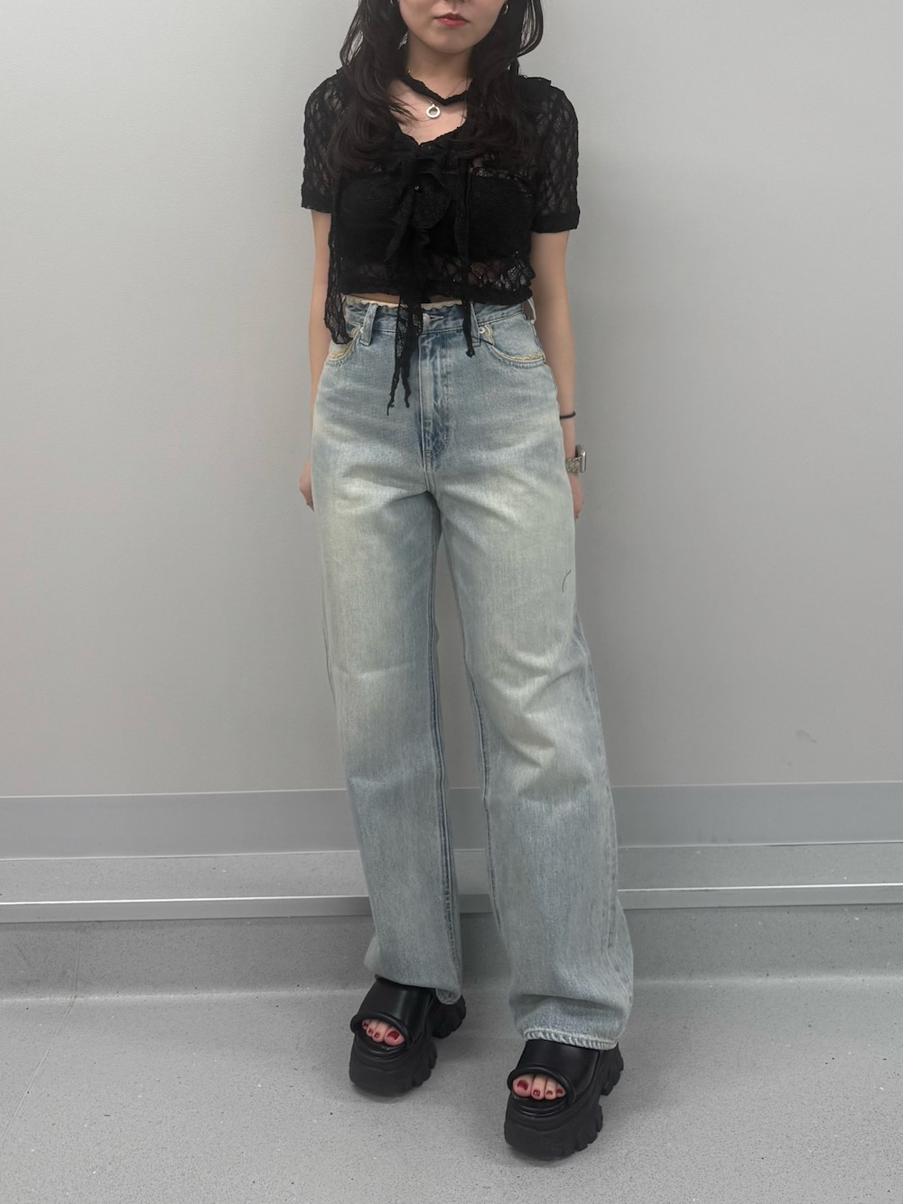 【トップス】チョーカー付きのレーストップスです。半袖のシンプルな形なので、デニムやスカート、ボトムスを選ばずご着用頂けます。 前開きなので羽織としてもお使い頂けます。 【ボトムス】レースがついたグラフィックのデニムです。ウエストとポケットについたレース、更には後ろについたレースが可愛く、ショート丈のトップスをよく着る夏にピッタリのアイテムです。155cmで、Sサイズ着用です。 【シューズ】厚底のフラットサンダルです。高さ10cmでスタイルアップ効果抜群ですが、フロントも厚底なフラットタイプなので足への負担が少なく着用頂けます。23.5cmでMサイズ着用です。