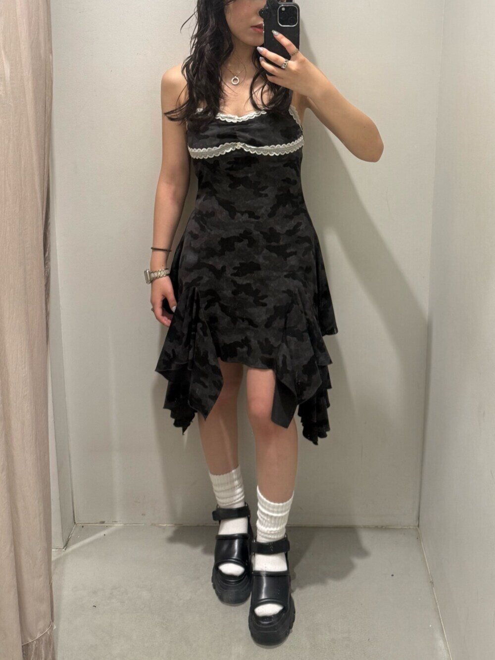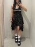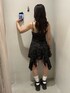 【ワンピース】中央が短く左右にフリルが伸びてるワンピースです。伸縮性があり肩紐はアジャスターで調節できるのでフリーサイズですがどなたでもジャストサイズでご着用頂けます。デニムをレイヤードしたりもできて、着回しも効くアイテムです。 【シューズ】厚底のフラットサンダルです。高さ10cmでスタイルアップ効果抜群ですが、フロントも厚底なフラットタイプなので足への負担が少なく着用頂けます。23.5cmでMサイズ着用です。