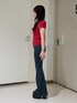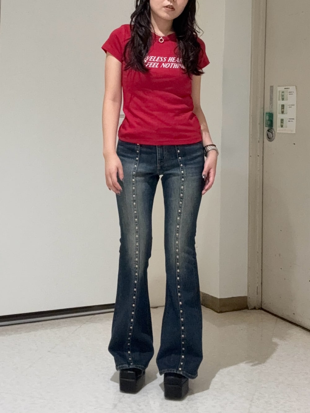 【トップス】今季トレンドの長めのタイトなTシャツです。ロゴの一部がグリッターになっていて、Y2Kぽく着られるアイテムです。 【ボトムス】デニムコレクションの中の1つのフレアデニムです。トレンド感あるスタッズデザインとハイウエストでスタイルアップ効果抜群です。155cmでSサイズ着用です。 【シューズ】スクエアデザインの厚底ブーツです。高低差が少なく足の負担が少ないので沢山歩くお出かけにもピッタリの1足です。23.5cmで少し大きめでLサイズ着用です。