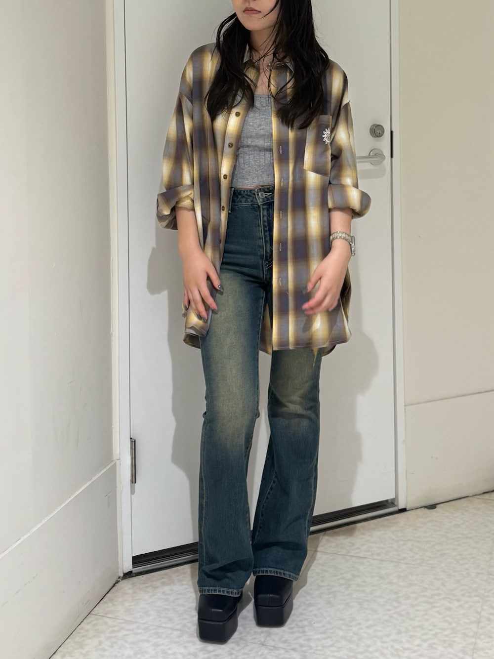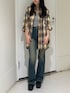 【トップス】アンサンブルデザインのトップスです。キャミソールのストラップがラインストーンになっていて、バラバラでも着回しが効くアイテムです。 【シャツ】秋感のあるオーバーサイズのチェックシャツです。後ろはかなり長めなのでワンピース風にも着用しやすくなっています。 【ボトムス】ヴィンテージデザインの人気のフレアデニムにダメージが入ったアイテムです。ストレッチ性はあまりない分ボディラインを拾いすぎずスタイルアップしてくれます。155cmでSサイズ着用です。 【シューズ】スクエアデザインの厚底ブーツです。高低差が少なく足の負担が少ないので沢山歩くお出かけにもピッタリの1足です。23.5cmで少し大きめでLサイズ着用です。