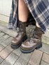 【トップス】ショート丈のフーディです。裾にゴムが入っているのでウエストがしっかりと見えるのでスタイルアップ効果も抜群です。 【スカート】スリットが入ったチェックのスカートです。腰周りがスリーブデザインになりトレンド感のあるアイテムです。 【ブーツ】厚底のレースアップブーツです。底がシャークソールになっているので、デニムなどを合わせても可愛い部分がしっかりと見えます。 23.5cmでLサイズ着用です。