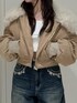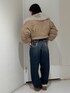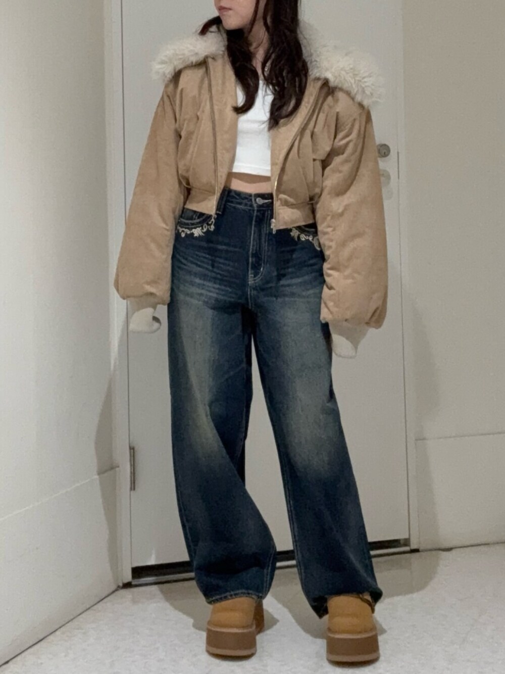 【アウター】襟が取り外し可能なショート丈のアウターです。かなり短めのデザインなのでハイウエストのデニムと合わせるとスタイルアップ効果抜群のアイテムです。 【ボトムス】刺繍のデザインのデニムです。EVRISのデニムの中では比較的ルーズな作りで、デザインもヴィンテージ感のあるアイテムです。155cmSサイズ着用です。 【シューズ】中がファー素材の厚底のスリッポンです。厚底なのでスタイルアップ効果もありつつ楽にラフに履けるアイテムです。 23.5cmでLサイズ着用です。