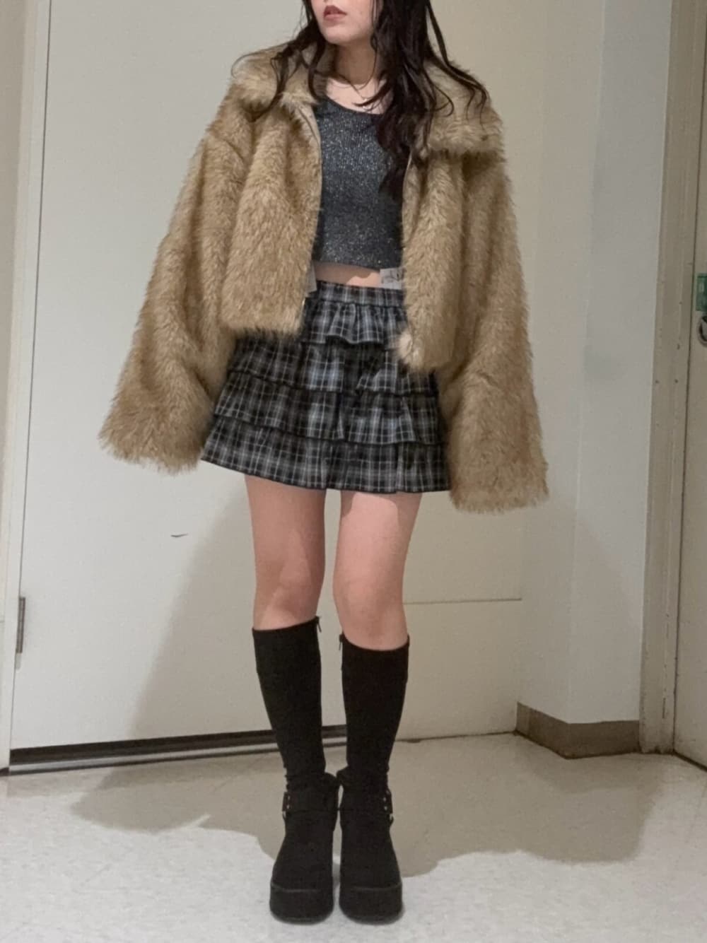 【ブルゾン】去年人気だったファーのアウターです。軽くて裏地がついた凄く着やすいアウターです。今年はカラーバリエーションも豊富でお気に入りの1着を見つけやすくなってます。 【スカート】今季トレンドのチェックのフリルスカートです。インナーショーツ付きなので履きやすいアイテムです。 【シューズ】スウェードの厚底ブーツです。高低差があまり無いので足への負担も少なくお履き頂けます。23.5cmで少し大きめでLサイズ着用です。