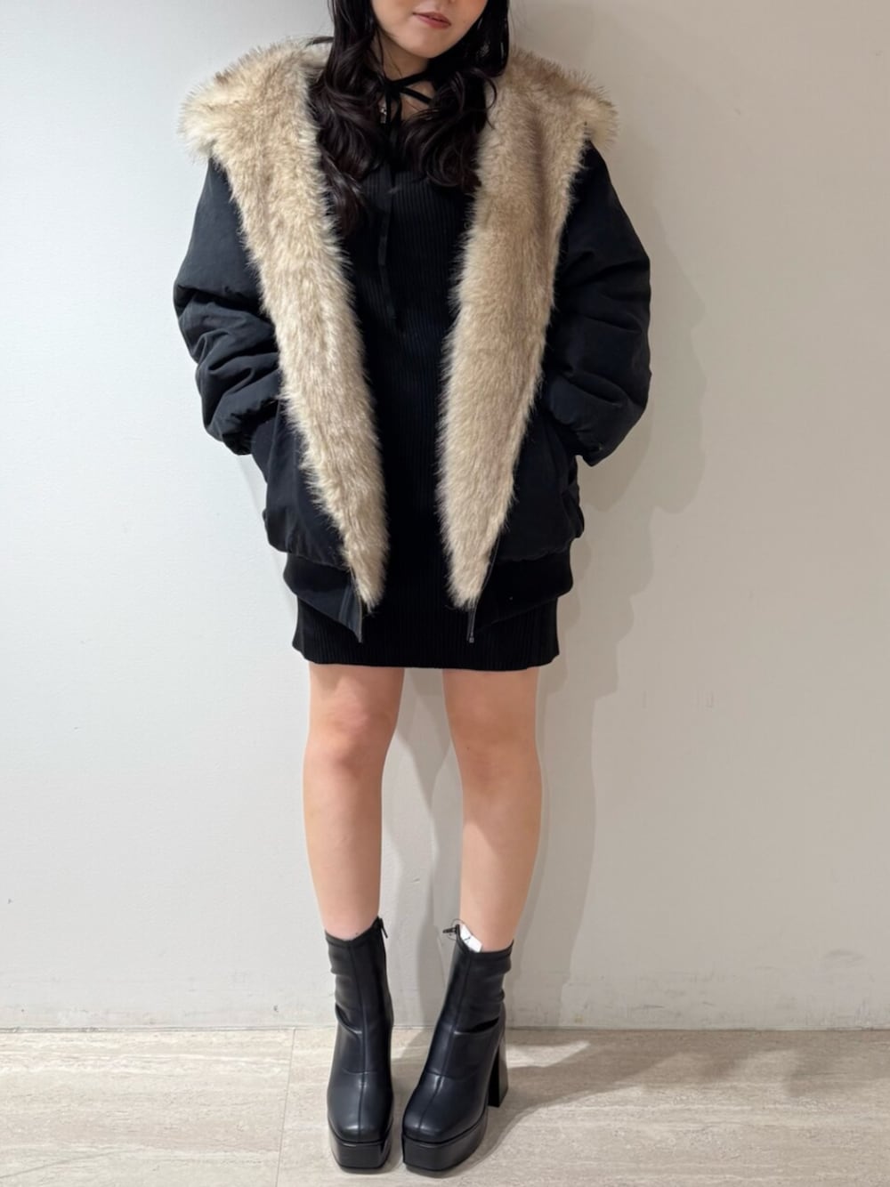 【アウター】リバーシブルのアウターです。表裏どちらもトレンド感のあるデザインなので、1着で2着をしっかりと楽しんで頂けるアイテムです。 【ワンピース】タイトのチョーカー付きのワンピースです。ぴったりしすぎてなく、着やすいアイテムです。 【シューズ】EVRISで毎年人気のヒールブーツです。筒が細いので美脚効果抜群です。23.5cmで少し大きめでLサイズ着用してます。