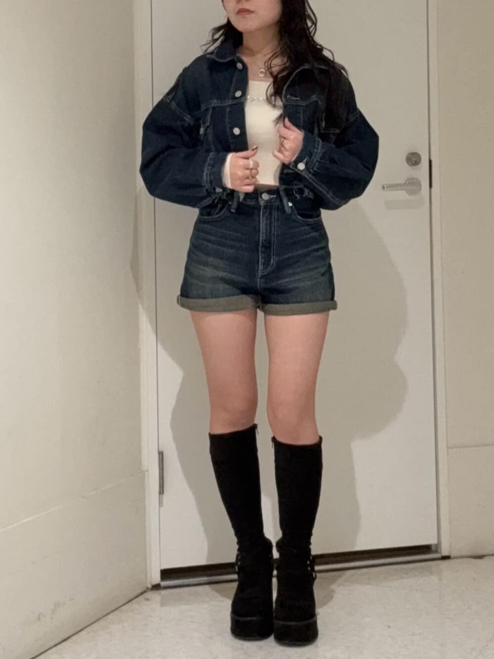 【ジャケット】セットアップのショート丈のデニムジャケットです。 ショート丈なので脚長効果抜群です。 【ボトムス】セットアップのデニムショートパンツです。 ロールアップのデザインが可愛く季節問わず使える便利なアイテムです。155cmでSサイズ着用です。 【シューズ】スウェードの厚底ブーツです。高低差があまり無いので足への負担も少なくお履き頂けます。23.5cmで少し大きめでLサイズ着用です。