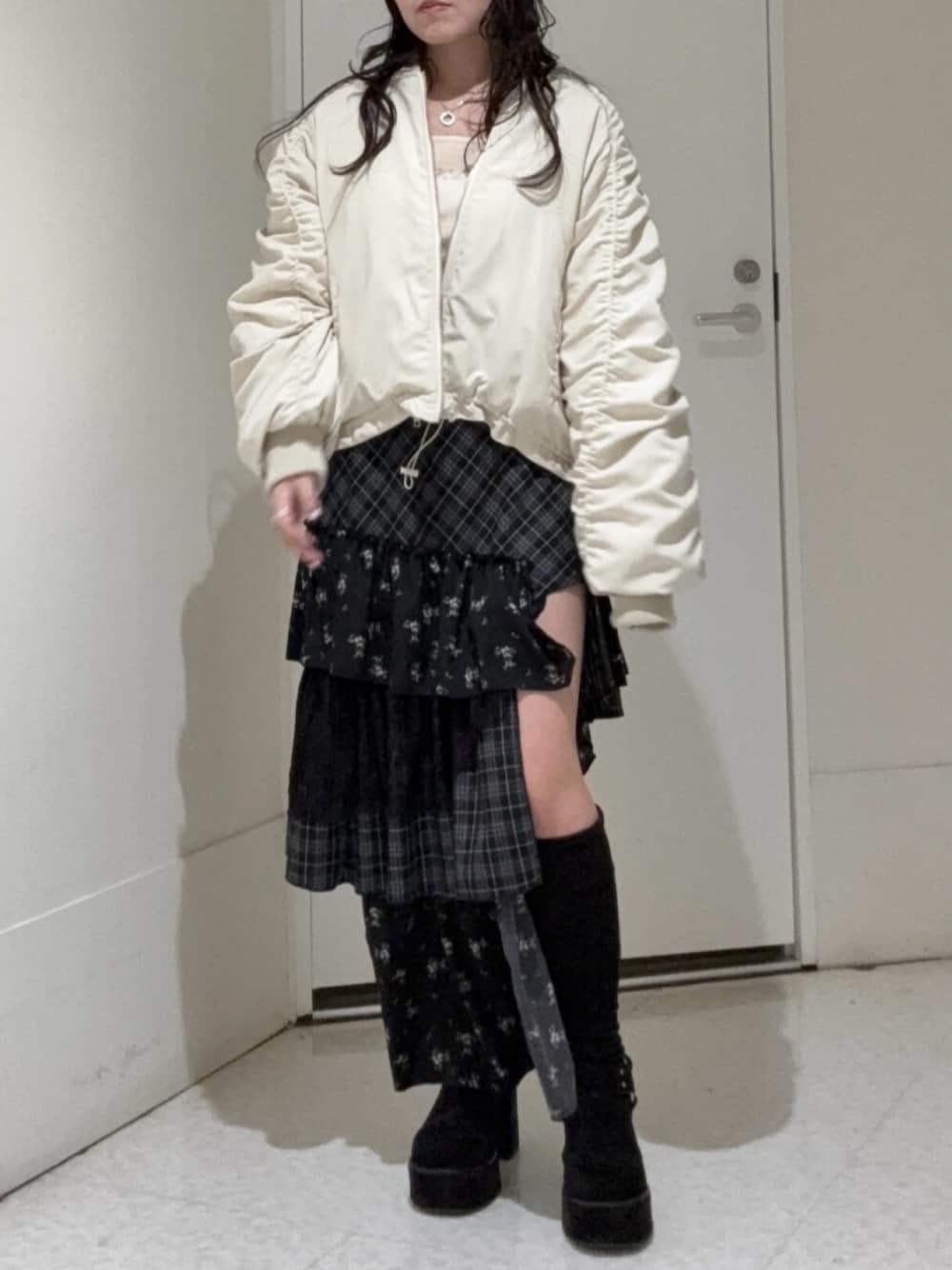 【アウター】EVRISで毎年人気のバラのデザインのブルゾンです。 デニムと合わせても、スカートと合わせても可愛い万能アイテムです。 【ボトムス】アシメデザインが可愛い花柄のスカートです。シューズやトップスの合わせ方次第で見栄感がかわる可愛いアイテムです。 【シューズ】スウェードの厚底ブーツです。高低差があまり無いので足への負担も少なくお履き頂けます。23.5cmで少し大きめでLサイズ着用です。