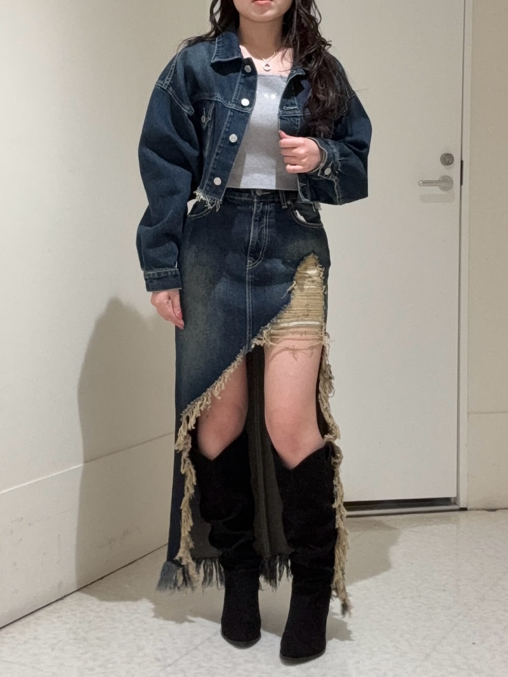 【ジャケット】セットアップのショート丈のデニムジャケットです。 ショート丈なので脚長効果抜群です。 【ボトムス】セットアップ着用可能なデニムロングスカートです。ざっくりと足元が開いていてスタイルアップ効果抜群です。155cmでSサイズ着用です。 【シューズ】取り外しのできるフリンジがついたウエスタンブーツです。 クシュっとしたデザインがトレンド感があり可愛いアイテムです。 23.5cmでMサイズ着用です。