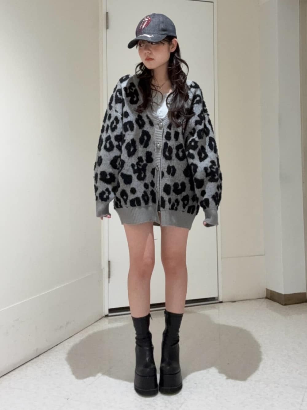 【キャップ】ローリング・ストーンズのロゴがラインストーンでついたデニム素材のキャップです。大きめのつばが使いやすいポイントです。 【トップス】ローリング・ストーンズのアイテムでオーバーサイズのカーディガンです。レオパード柄とスクールライクなボタンが可愛いアイテムです。 【ボトムス】セットアップのデニムショートパンツです。 ロールアップのデザインが可愛く季節問わず使える便利なアイテムです。155cmでSサイズ着用です。 【シューズ】ロングが人気だったブーツのショートバージョンです。足首がぴったりしていてスタイルアップ効果抜群です。23.5cmでMサイズ着用です。