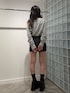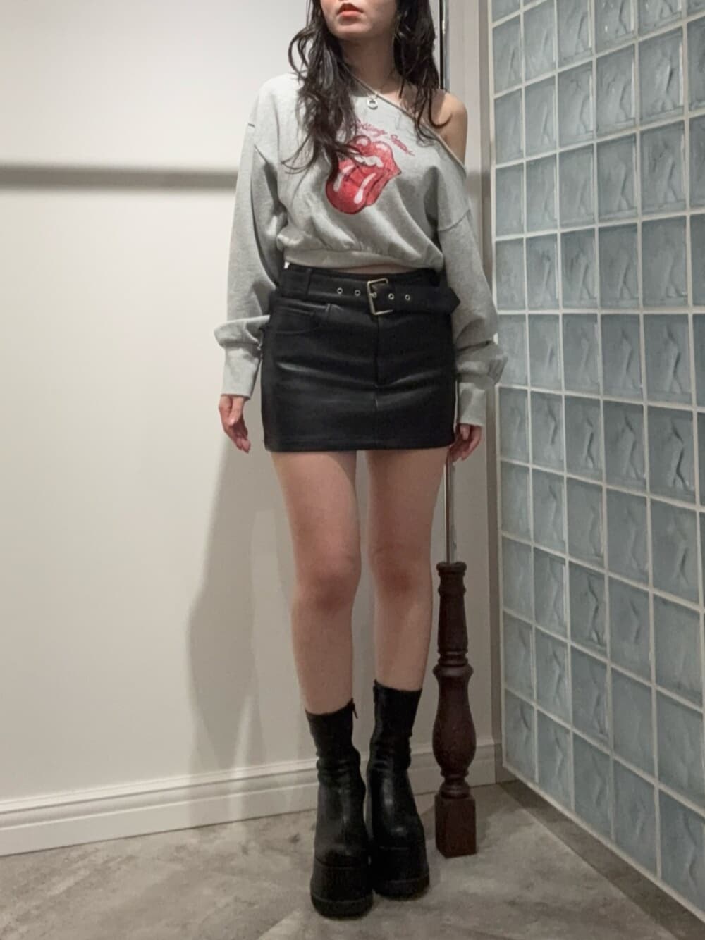 【トップス】ローリング・ストーンズのワンショルダートップスです。ピグメント加工ぽいカラーが可愛くガッツリワンショルのデザインがローリング・ストーンズのロゴと相性ピッタリのアイテムです。 【スカート】セットアップのレザースカートです。ベルトのデザインが可愛くインナーショーツつきなので履きやすいアイテムです。 155cmでSサイズ着用です。 【シューズ】ロングが人気だったブーツのショートバージョンです。足首がぴったりしていてスタイルアップ効果抜群です。23.5cmでMサイズ着用