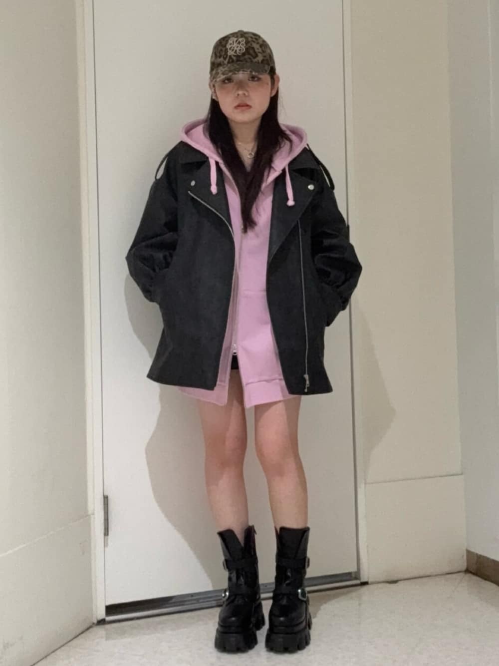 【トップス】オーバーサイズのジップアップパーカーです。春らしいカラーバリエーションが可愛く人気のダブルジップで暖かくなるこれからの季節にぴったりです。 【ジャケット】オーバーサイズのライダースジャケットです。素材に若干模様が入っているので、高級感が出るのが魅力です。 【シューズ】バックルのデザインがついた厚底のブーツです。 高低差がなく歩きやすく、更にシャークソールのデザインも可愛いアイテムです。23.5cmでMサイズ着用です。