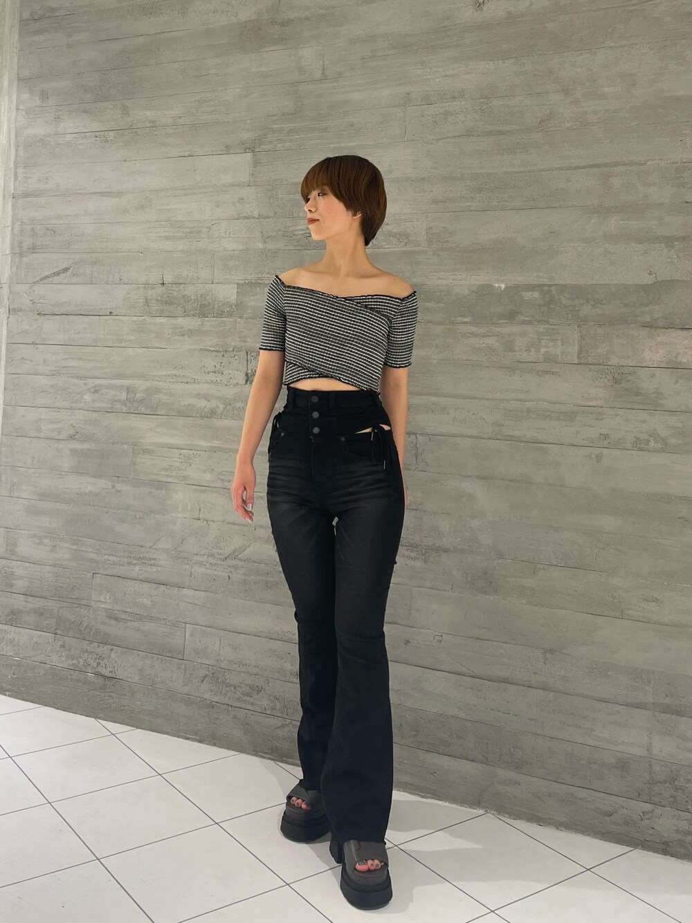 tops▶︎ 身体にフィットするトップスは、コンパクトかつクロスデザインで細見え効果があります🖤 ショートトップスのため、ハイウエストのボトムと一緒に合わせると相性抜群です! denim▶︎ 大人気EMODAのフレアデニムから新デザイン誕生です!サイドのリボンでクシュっとさせて肌見せすると夏らしさ、可愛らしさが出るのでオススメです! shoes▶︎ ソールが柔らかく、履き心地も軽いため、厚底初心者さんでも履いていただきやすいです! 【tops、denim、shoes】 7/1(土)店舗発売です💫