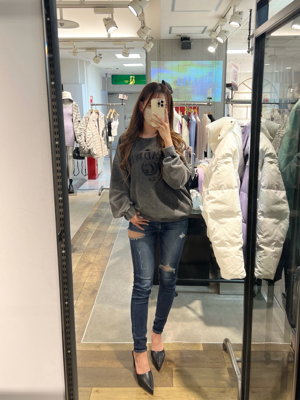 カジュアルコーデ♡ 【tops】ヴィンテージ加工がポイントのオーバーサイズのスウェット!同色の刺繍で高級感のあるデザインです!163cmの私でもおしりすっぽり隠れる長さになります!【bottom】GYDAでは大人気のダメージデニム👖 太ももが空いたセクシーなデザインがポイントです!ハイウエストより少し浅めのミドルウエストなのでショート丈のトップスと合わせて頂くのもオススメです!【shoes】GYDA定番ポインテッドミュールのNewデザインが登場しました!前に厚底が付き、太めのヒールになったことで安定感があり、とっても歩きやすいです!