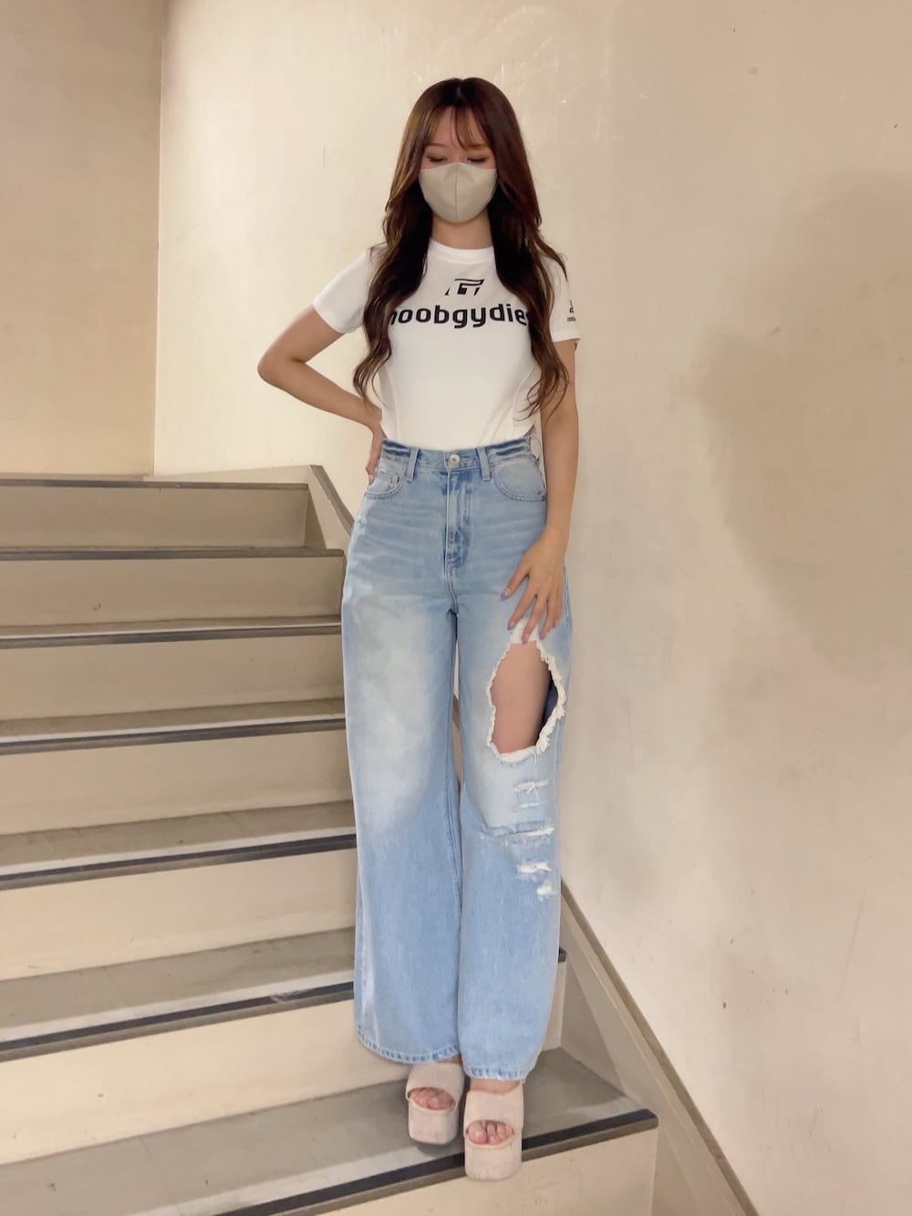 カジュアルコーデ🌼 【tops】トレンドのユニフォームデザインが施されているショート丈のTシャツ!裾のラウンドデザインがポイント♡ウエストが空いていることで、スッキリ見せてくれ細見え効果抜群!生地は肌触りよく、夏にぴったりです! 【bottom】大胆なダメージがポイントのワイドパンツ!ハイウエストでウエストがキュッとなっているので、スタイルアップしてくれます! 【shoes】毎年大人気のコルクサンダル!履くだけで春夏気分を味わえます♡安定感があり、とっても歩きやすいです!