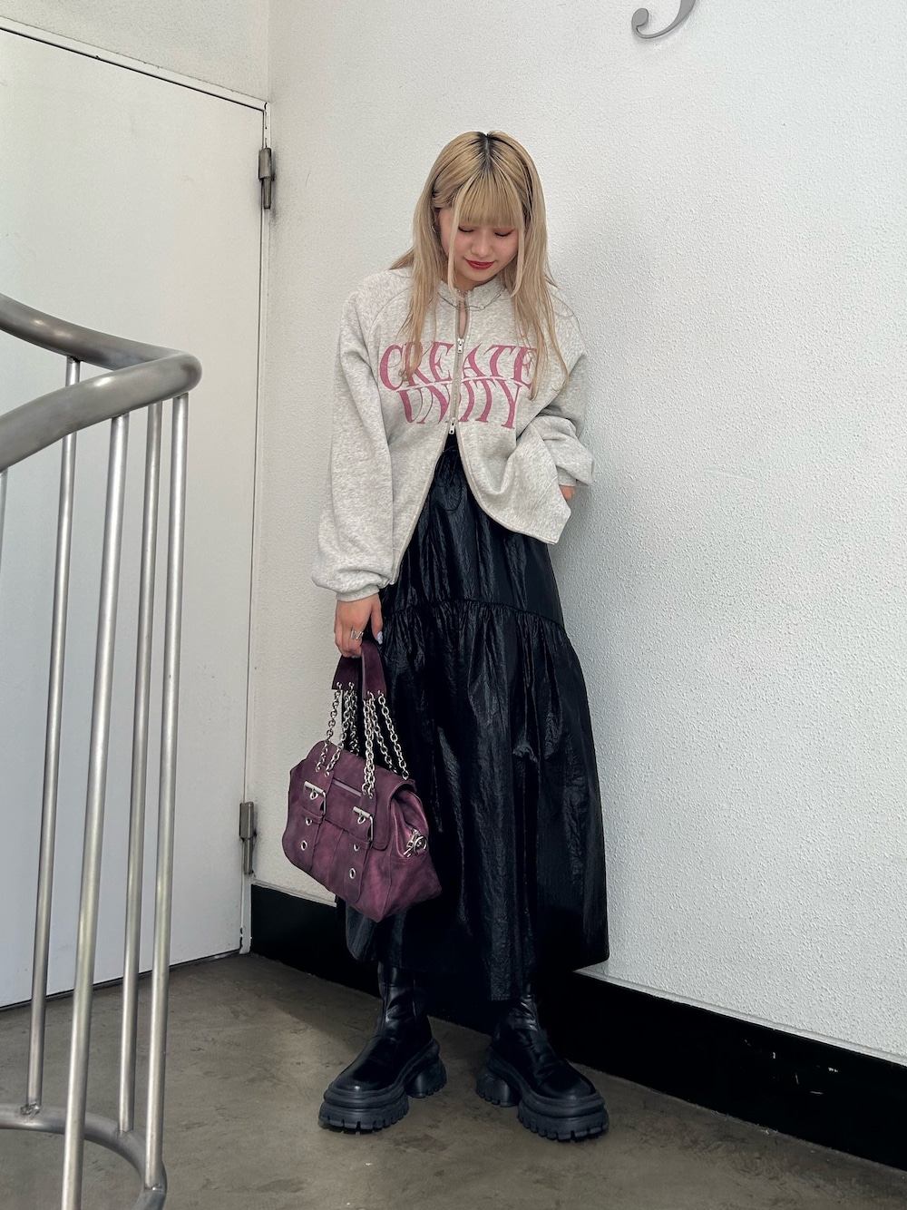 MIXコーデ🩶🩷 【トップス】 フロントとバックのデザインが可愛いプルオーバー🤍 ダブルZIPなのでインナー見せするスタイルもおすすめ! 【スカート】 トレンドのメタリック素材のフレアスカート🫶🏻 ウエストのドロストデザインがアクセントになって可愛い◎ ハイウエストで履けるので足長効果も抜群! 160cmで足首より少し上の丈感です! 【バッグ】 ベルトとチェーンのデザインが可愛いバッグ。 大容量なのもポイント◎ 【ブーツ】 25cmでLサイズ着用。 ボリュームソールで重ためのデザインが可愛い🤍軽いので長時間歩いても疲れないのも嬉しい!