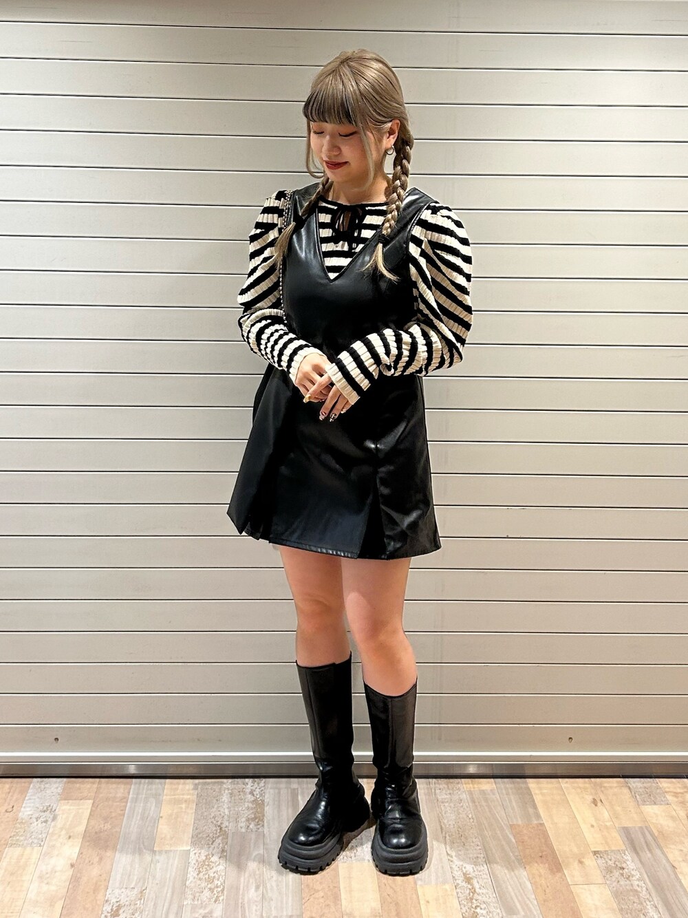 ガーリーコーデ🖤🤍 【トップス】 フロントリボンとパフスリーブでガーリー好きさんにおすすめのトップス。モチモチとした手触りの良い伸縮性のあるニットは着心地抜群◎ 【ワンピース】 深めのVデザインでレイヤードスタイルも楽しめるワンピース。 フェイクレザーなので軽く柔らかい素材です! ウエストベルト付きでスタイルアップ効果も◎ 【バッグ】 チェーンがアクセントのトートバッグ。 A4がすっぽり入るサイズ感で大容量! 【ブーツ】 25cmでLサイズ着用。 ボリュームソールで重ためのデザインが可愛い🤍軽いので長時間歩いても疲れないのも嬉しいポイント!