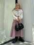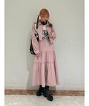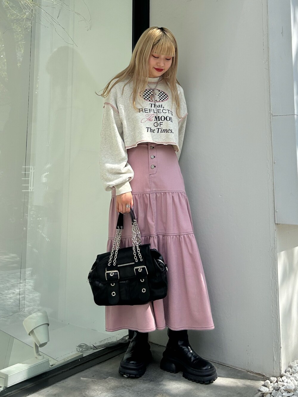 ピンクコーデ🩷 【トップス】 フロントのわんちゃんプリントが可愛いトップス。ステッチがピンクなのもポイント🤍 クロップド丈なのでハイウエストのボトムを合わせるスタイルがオススメ◎ 【セットアップ】 ジャケットとスカートがセットのお得なセットアップ🤍 淡いピンク色なので上下ピンクでも甘すぎず普段使いしていただきやすいカラーです! フロントのボタンデザインがアクセントに◎ ウエストの後ろ部分がゴムなのも嬉しいポイント! 生地感は厚すぎないので春や秋も着ていただけます🤍 【バッグ】 ベルトとチェーンのデザインが可愛いバッグ。 大容量なのもポイント◎ 【ブーツ】 25cmでLサイズ着用。 ボリュームソールで重ためのデザインが可愛い🤍軽いので長時間歩いても疲れないのも嬉しい!