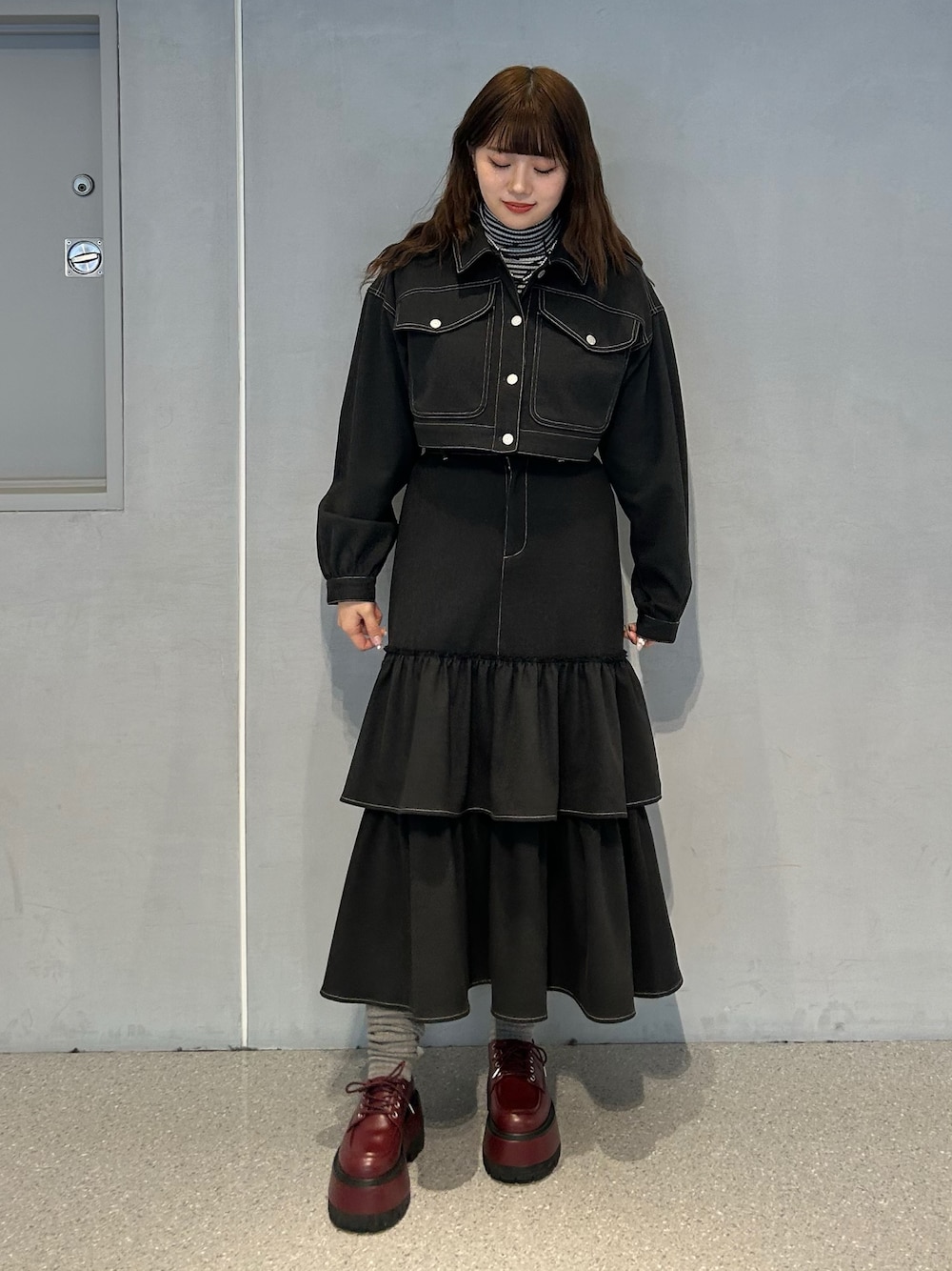 【セットアップ】 ジャケットとスカートがセットのお得なセットアップ🤍 フロントのボタンデザインがアクセントに◎ ウエストの後ろ部分がゴムなのも嬉しいポイント! 【タートル】 ボーダーのタートルネックはコーデのアクセントに◎ 【シューズ】 厚底で大きめのシルエットですが、 軽くて歩きやすいのが嬉しいポイント◎ ソックス合わせでレトロに◎