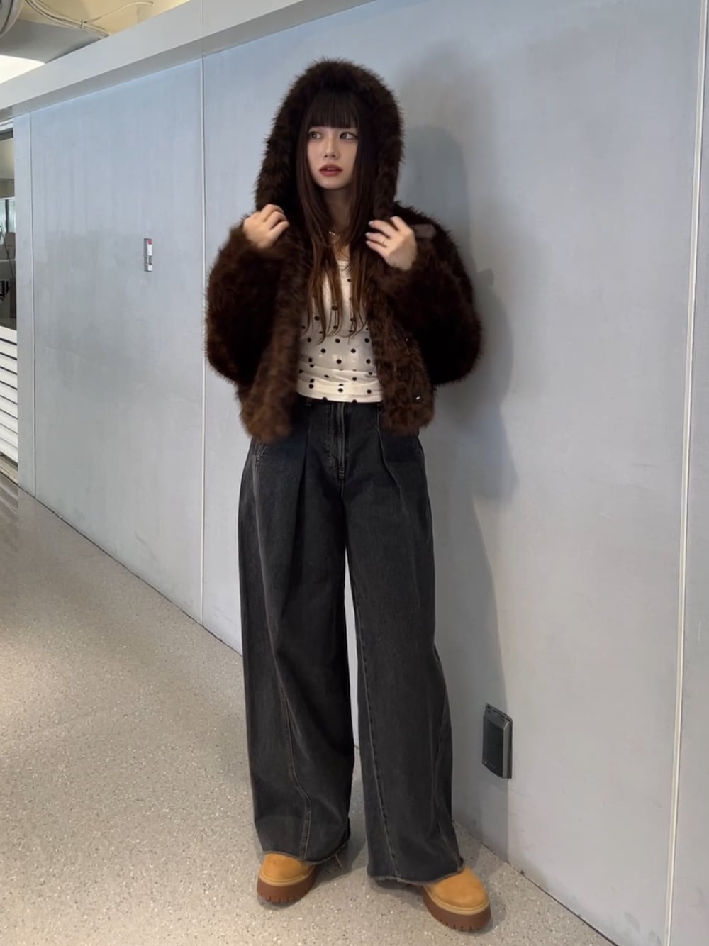 MOMOKA(jouetie)のブルゾン「ベルトフードファージャケット/ファーコート」を使ったコーディネート