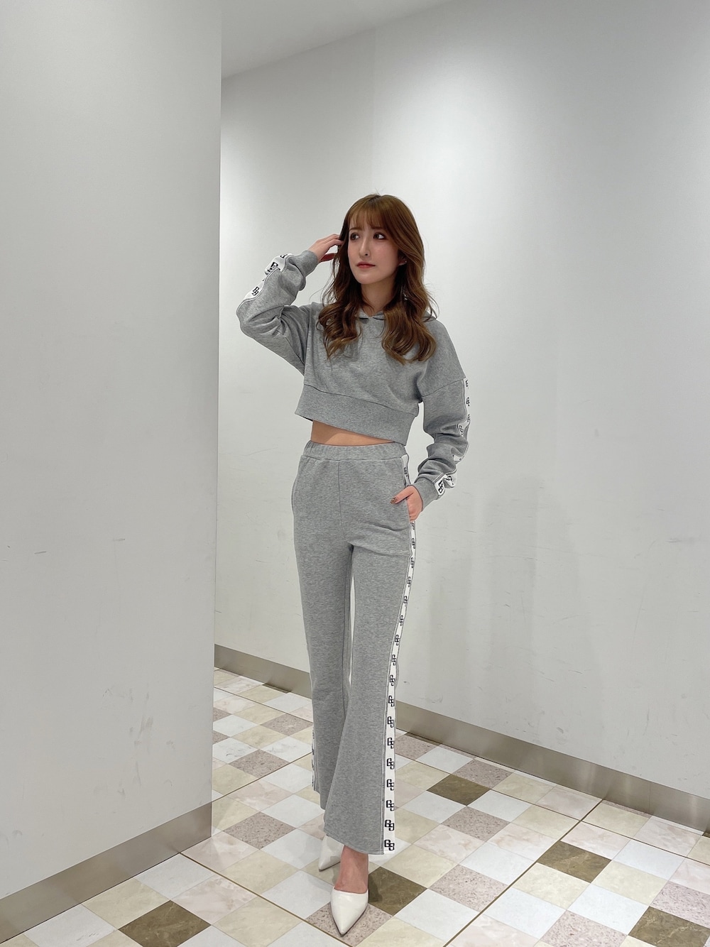 【トップス】 バックスタイルのレースアップデザインがポイントのパーカー🤍 ショート丈なのでハイウエストのパンツ合わせが◎ 【パンツ】 おへそが隠れるくらいハイウエストでヒザ下からフレアにもなっているので美脚効果抜群🦵🏻✨ サイドのロゴラインがあることで細見え効果も💖 【シューズ】 シンプルですがカジュアルにも綺麗めにもどんなコーデにも合わせやすいデザインになっております◎