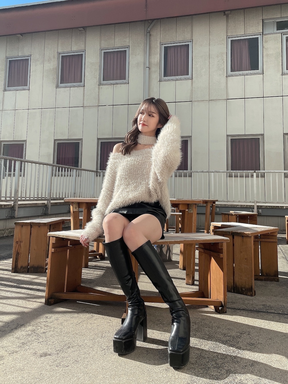 【トップス】 定番アイテムのチョーカーシャギーニット♡ 毛足長めのシャギーでとても暖かく、前後2wayでも着ていただけるのでコーディネートの幅が広がります!◎ 【スカート】 GYDAで毎年大人気のレザースカート♡ インナーパンツになっているので安心して履いていただけます◎ 【ブーツ】 フェイクレザー素材なので伸縮性があり履き心地抜群のロングブーツ♡ 高低差が少ないので歩きやすく足が疲れにくいのもポイントです☺︎