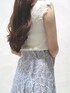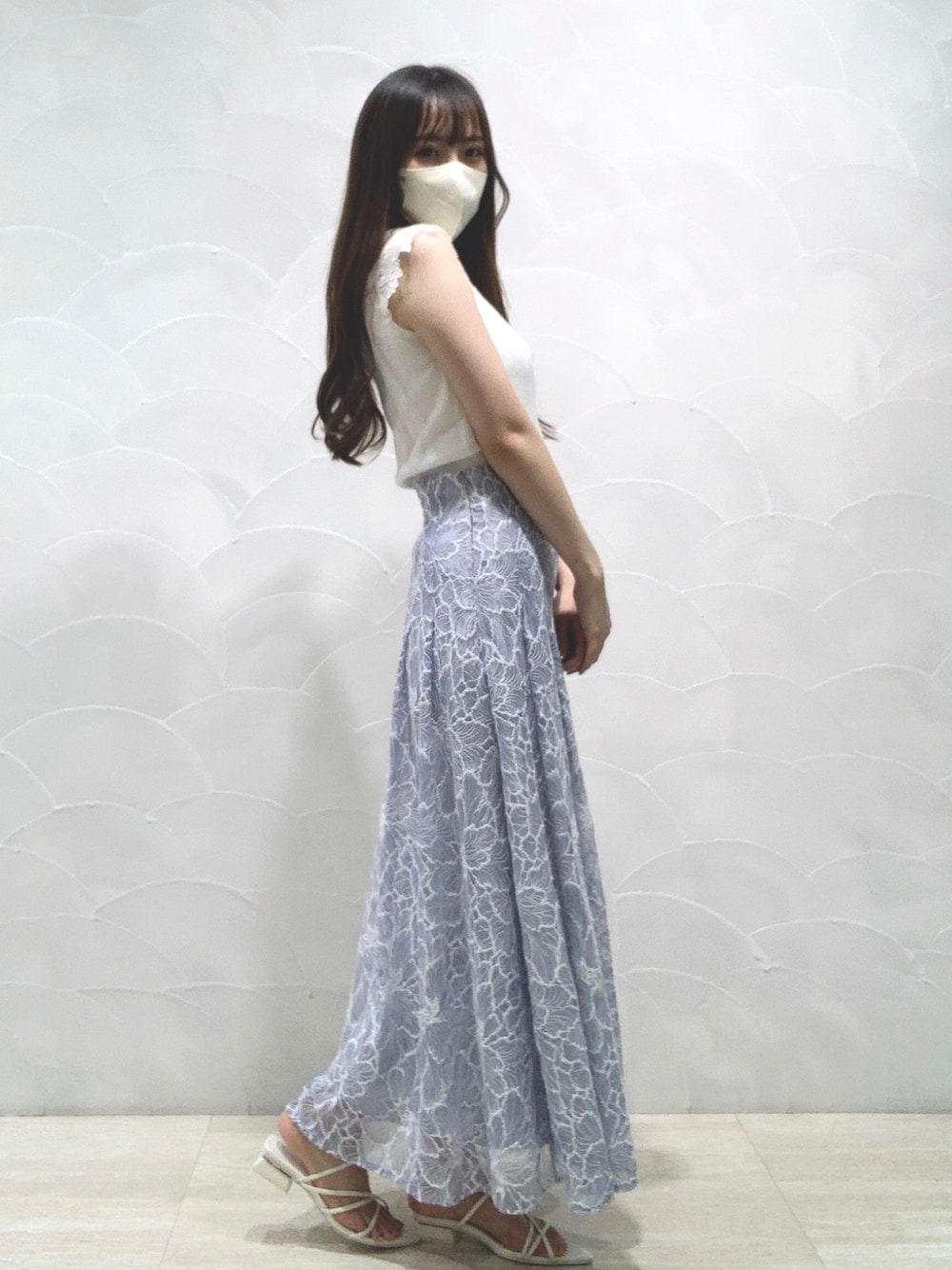 肩の刺繍がワンポイントになっていて女性らしいニット💕 レースのデザインが二の腕をスッキリ見せてくれます!ニットと同系色の刺繍なのでさりげない感じがかわいいです! スカートは大きな花柄のレースが大人可愛い! 163cmMサイズ着用でくるぶし上5センチくらいの丈感で上品に着れました! サンダルはポインテッドトゥできれいに見え、コーディネートを上品にまとめてくれます!