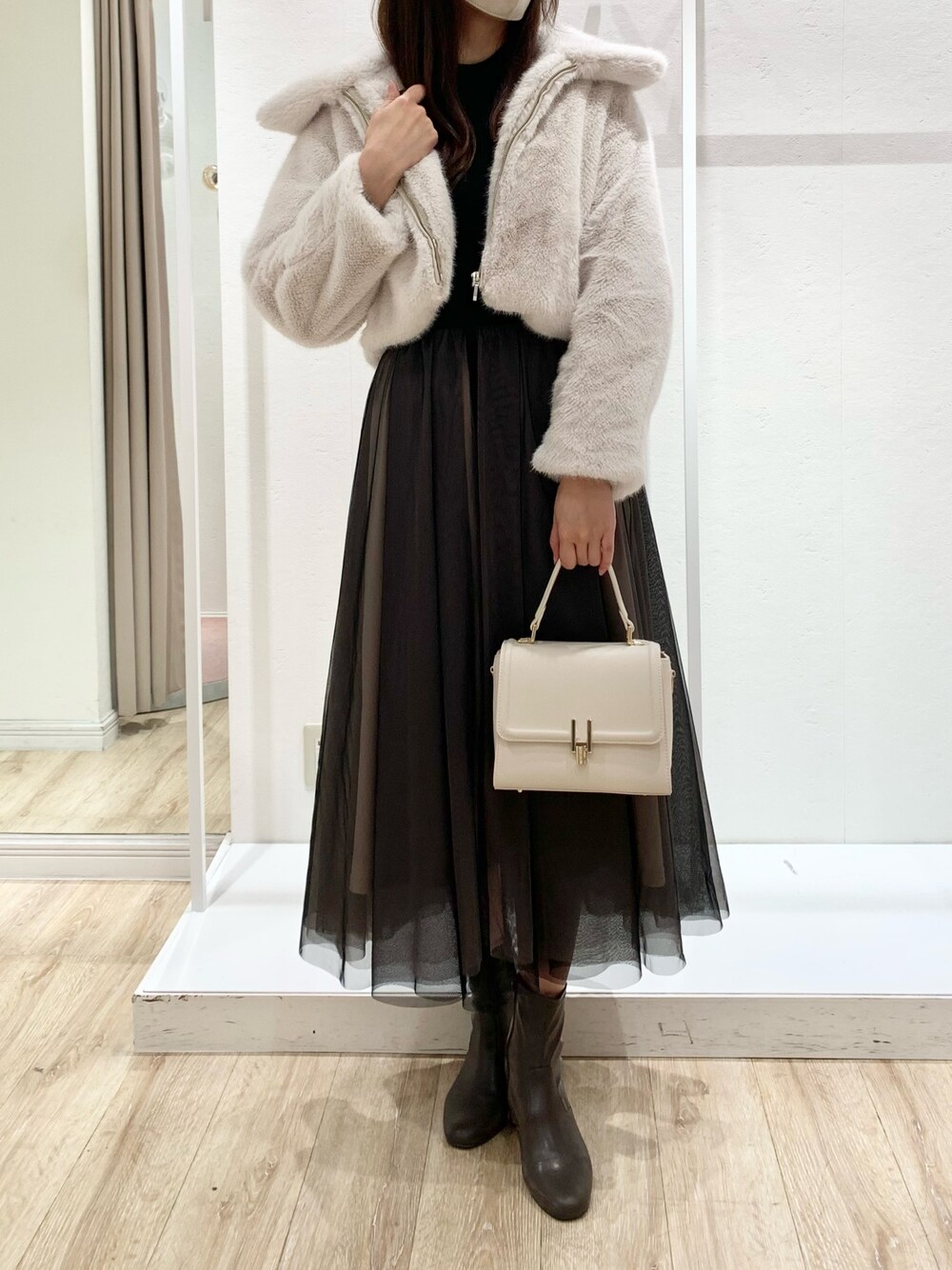 冬満載のフェミニンコーデ🪄⛄️ ワンピースは横浜店人気No. 1💫 トップス部分は前後2wayで着用可能な仕様で、前後で雰囲気を変えてきていただけます! ファスナーはなく被るだけでコーデが完成するので最高です🥳 ファーコートは触り心地抜群☁️! ふわふわの襟が首に沿うので顔が小さく見え、可愛くさらに暖かいなんて最高です😭❤️🔥 クロップド丈なのでワンピースとの相性が良く、フェミニンに着こなせます!冬のデートコーデにもってこいでは…?🥹 163cm普通体型Sサイズ着用で腰ちょうどの丈感です!