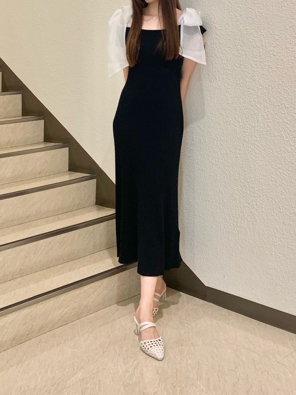 甘めなニットワンピース🎀🎀 シフォン素材の大きいリボンで華奢見えします! 体に沿うピタッとしたシルエットに裾がフレアのマーメイドなのでメリハリが出て、ウエストがキュッと締まってみえます! サラッとしたサマー素材のニット生地なので夏のお出かけコーデにぴったりの一枚です!