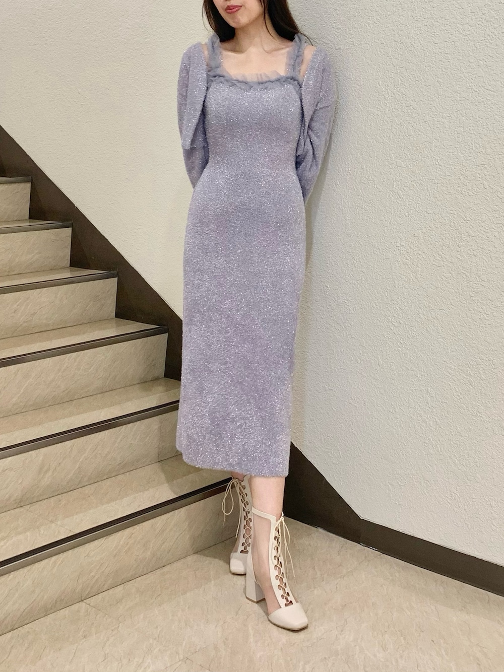 NAMI(MERCURYDUO)のワンピース「ラメシャギーカーデセットキャミニットワンピース」を使ったコーディネート