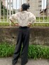 【大人カジュアルモノトーンコーデ😎🖤】 *shirt 裾を下ろすとガーターがついているかのようなデザインになり、裾を肩のホックに留めると一気にショートシャツに変身😳✨差がつくデザインシャツです🫶🏻ごわつかない生地で着心地も🙆♀️💮 *pants ローウエストでずるっとした感じが綺麗めになりすぎずUngridらしいバランスで履いていただけます💓161㎝、厚底ブーツ合わせ、Mサイズ着用で地面すれすれのずるっと感なのでフラットが多い方はSサイズでも丁度いい丈感で履けそうです☺️ *boots ヒールは苦手だけどスタイル盛りたい!方に心からオススメしたいブーツ🥾存在感があり足元に程よく重みが出ます❤️🔥長時間歩いても疲れにくく、遠出するときもいつもこれ履いてます✊💕 *beanie ニット帽似合わなくて持ってなかった私が唯一これなら!とリアルバイしたニット帽🥰折り返しのないタイプなのでカジュアルになりすぎず綺麗目コーデにもばっちり合います🫶🏻後ろめに被るのがオススメです🌟