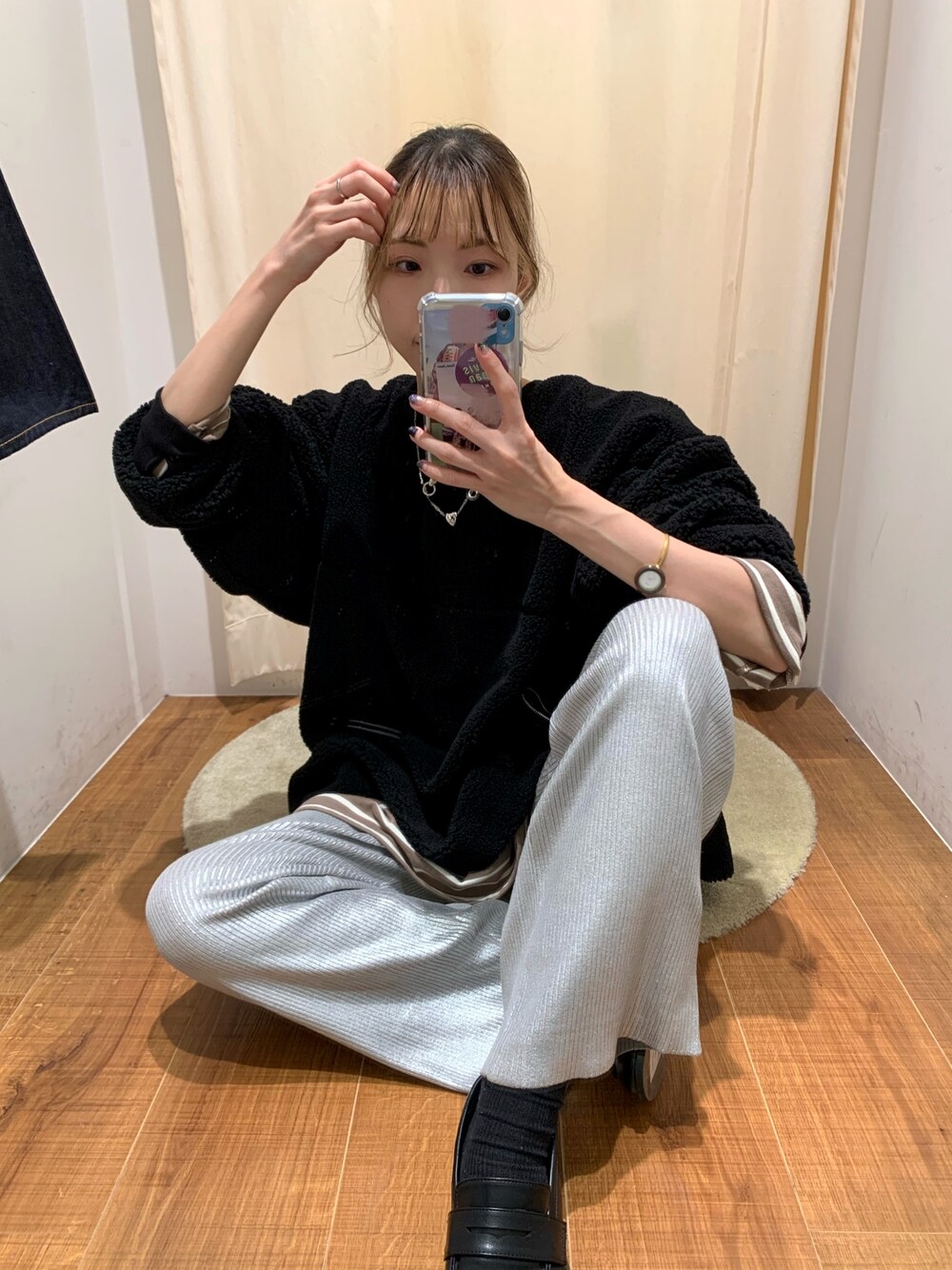 らくちんコーデ🫰🏻💓 アクティブに動く日にも着やすく!でもオシャレに見せたい!を叶えてくれるコーデにしてみました☀️ *tops もこもこがあったかかわいい❤️🔥サイドジップでレイヤードを楽しめます!気温に合わせてカットソーやシャツを入れたり、ハイネックトップス合わせで防寒も兼ねても🙆♀️🧣お袖にフィンガーホールも空いてるのでさりげなく女性らしい印象にしてくれます🥰 *pants ギラギラすぎない箔プリントで合わせやすい🤍🤍ニット素材なのでスルッと楽ちんに履けちゃいます!✨トレンド感も出してくれるのでニットパンツだと少しラフになりすぎちゃう、、って方にもオススメ😚 *shoes 秋になると履きたくなるローファー🍁ラフなコーデに合わせても程よく締まって見せてくれます!金具などの装飾もないのでビジネスシーンでも使いやすいです♡
