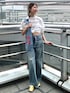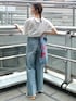 【カジュアルになりすぎないTee×デニムコーデ👖】 Tee×デニムの「夏の王道カジュアルコーデ」って可愛いけど私が合わせると「ちょっとそこまでコーデ」になってしまうのが長年の悩みでした🥺 ゆるっとずるっと合わせると私にはカジュアルすぎてしまうのでTシャツの裾を結んで肌見せすることですっきり女性らしく❣袖も折り返すと◎ 足元はスクエアトゥーのパンプスでラフだけど品がある印象に仕上げました☺️ デニムはずるっと履きたかったので161㎝25inch着用です💭