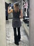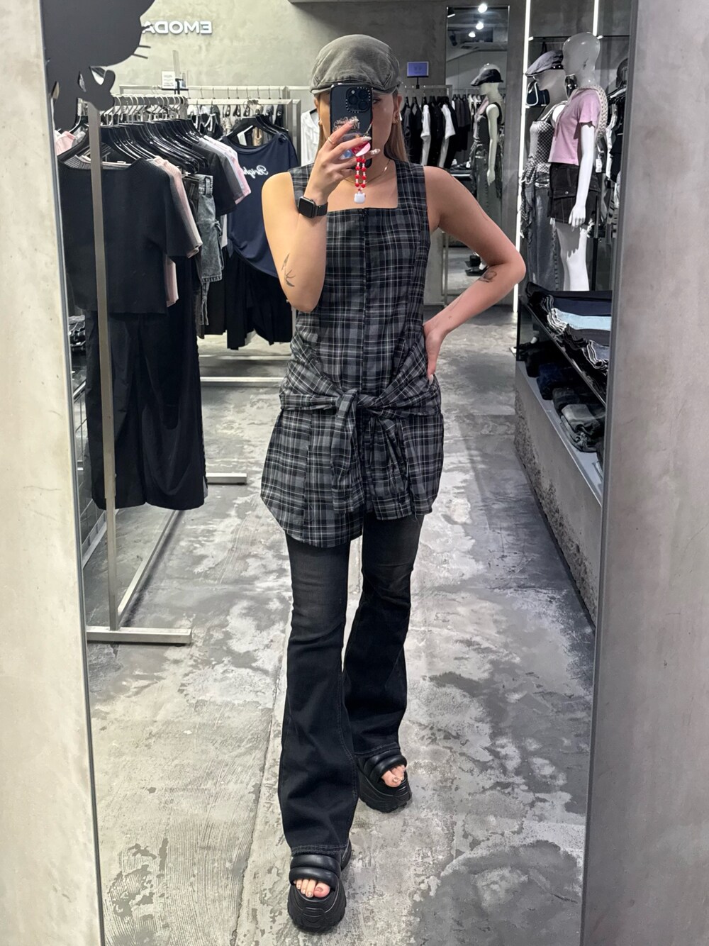 [ワンピース]チェックデザインが目を引くミニワンピースです。 ウエストの腰巻きデザインが今季らしいデザインになっています。 1枚での着用も◎ですが、インナーショーツが入っていないワンピースの為デニムとのレイヤードスタイルもおすすめです。 [デニム]4つボタンののハイウェストデザインのフレアデニムです。 スーパーハイウェストの為脚長効果抜群デニムです。 [シューズ]10cmヒールの厚底サンダルです。 ソール部分にエアーが入っている為、足の衝撃を吸収してくれる為、長時間での着用も◎ 23.5cmでMサイズを着用しています。