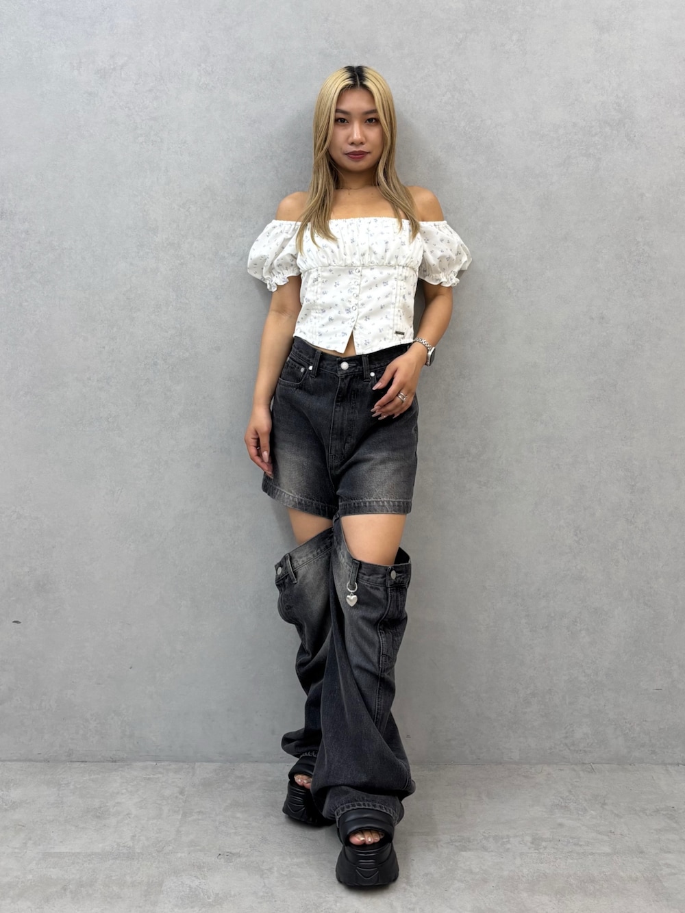 【トップス】(店舗限定) オフショルとしても2WAYでご着用いただけます🙂↕️袖はボリュームありますが、身頃はタイトめなのでワイドデニム合わせでカジュアルダウンしたスタイリングもオススメです🪄 【デニム】 大きく開いたカットデザインとズルっとしたシルエットが今季らしいアイテムです🪄インパクトのあるデザインなのでスタイリングの主役になってくれます💞154cmでSサイズ着用です! 【サンダル】 ぽってりとしたデザインでボリュームのあるエアソールがポイントのスポーツサンダル☀️約10センチのソールで脚を綺麗に魅せつつ、クッションが入っているので履き心地も抜群です✨️23.5cmでMサイズ着用です!