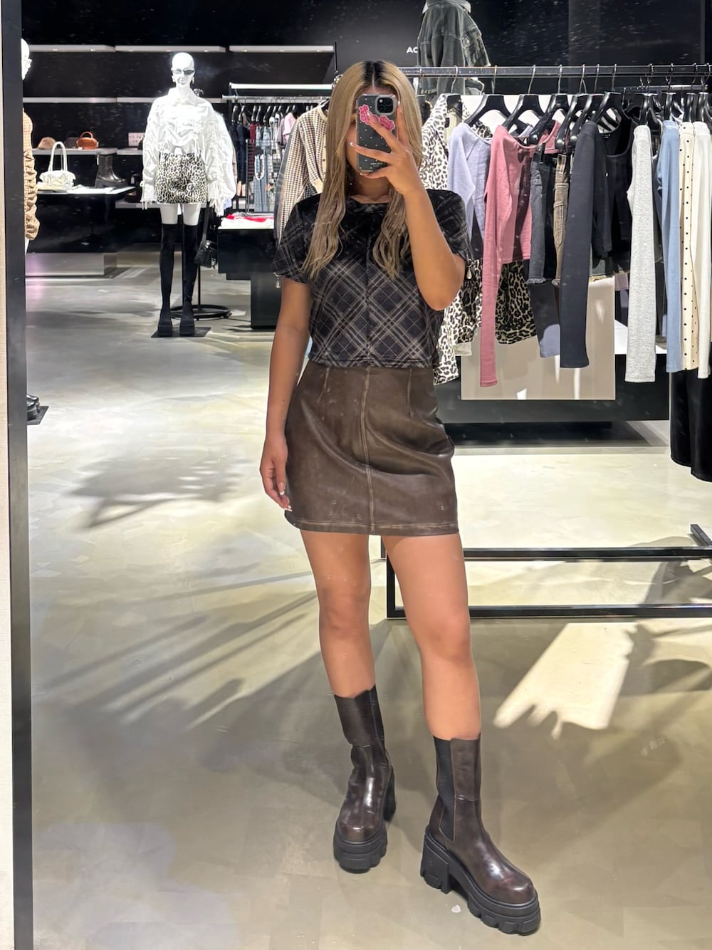 【トップス】 ベロア素材で秋を先取りできちゃうトップスです🍂袖のチャームは取り外し可能でシンプルなトップスとしてもお使いいただけます⭕️秋にはアウターのインナーとして使うのも可愛いです💖 【スカート】 今までよりハイウエストの長さを短くし、今季のスタイリングに合わせやすいバランスになっています✨️ウエスト細めで太もも周りはゆとりあるAラインシルエットでスタイルアップします🪄 【シューズ】 毎年大人気のブーツ 👢ヒール8.5センチの厚底デザインですが、傾斜が少なく軽いので長時間歩いても疲れにくいです✨️23.5cmでMサイズ着用しております🦶🏼