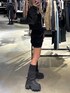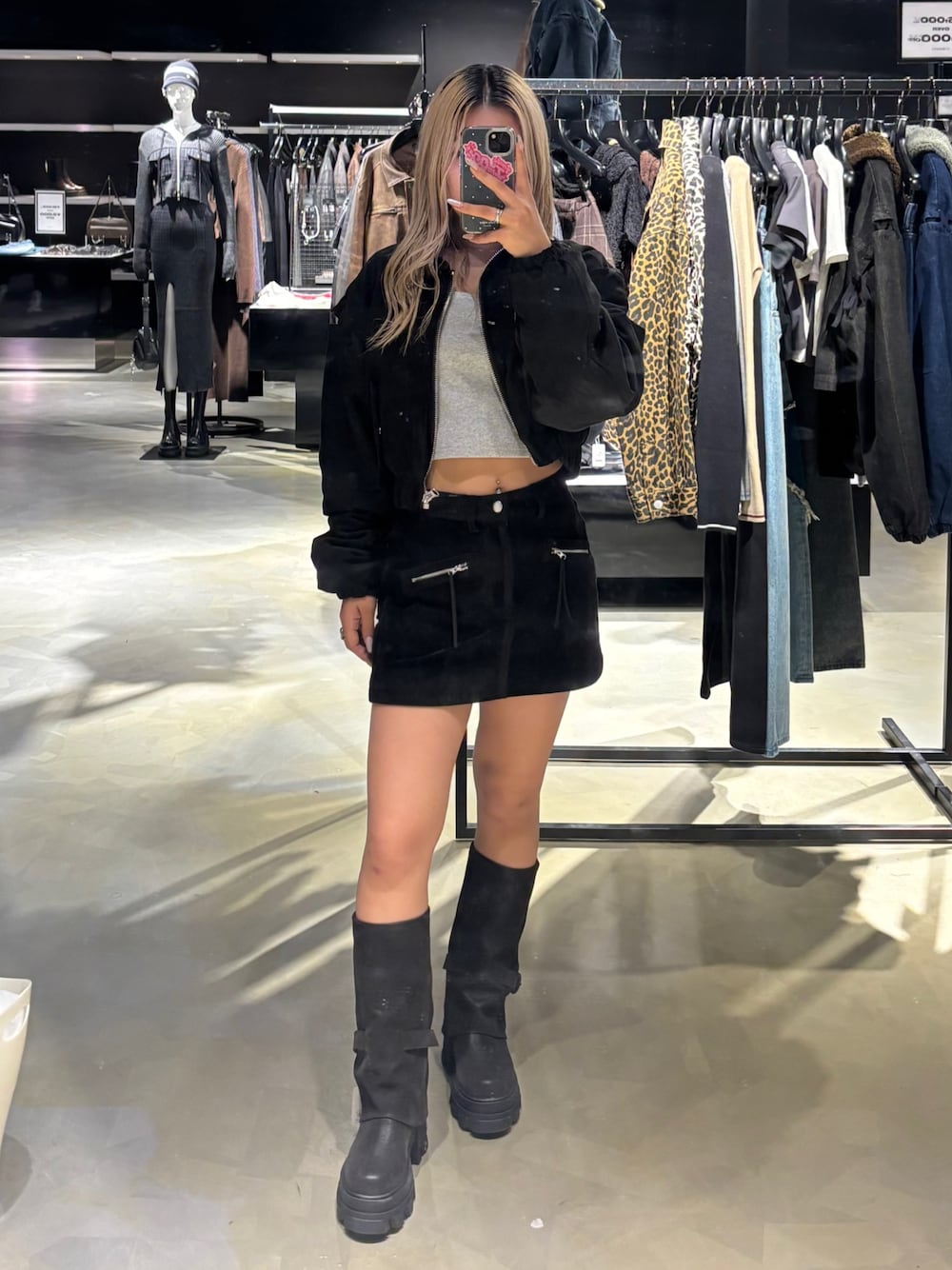 【アウター】 肩がレースアップデザインになっているスエードブルゾン💖ショート丈でどんなスタイリングにもバランス良く合わせていただけます✨️中綿入りでしっかりボリュームがあるのもポイントです🪄 【トップス】 胸元のハートプレートをポイントにしたシンプルなカットソーで、1枚着からインナーとしてもお使いいただけます🤍スクエアネックでロングスリーブなので華奢見え効果もあります✨️ 【スカート】 フェイクスエード素材でアウトポケットデザインがポイントです💖インナーパンツ付きなのでミニスカートでも安心🙂↕️身長154cmでSサイズ着用です! 【ブーツ】 トレンドのカバーブーツ✨️約8.5cmの厚底ですが傾斜が少なく安定して歩きやすいです🚶♀️ふくらはぎの太い部分を隠す丈感なので脚を細く見せてくれます💞23.5センチでMサイズ着用しております!