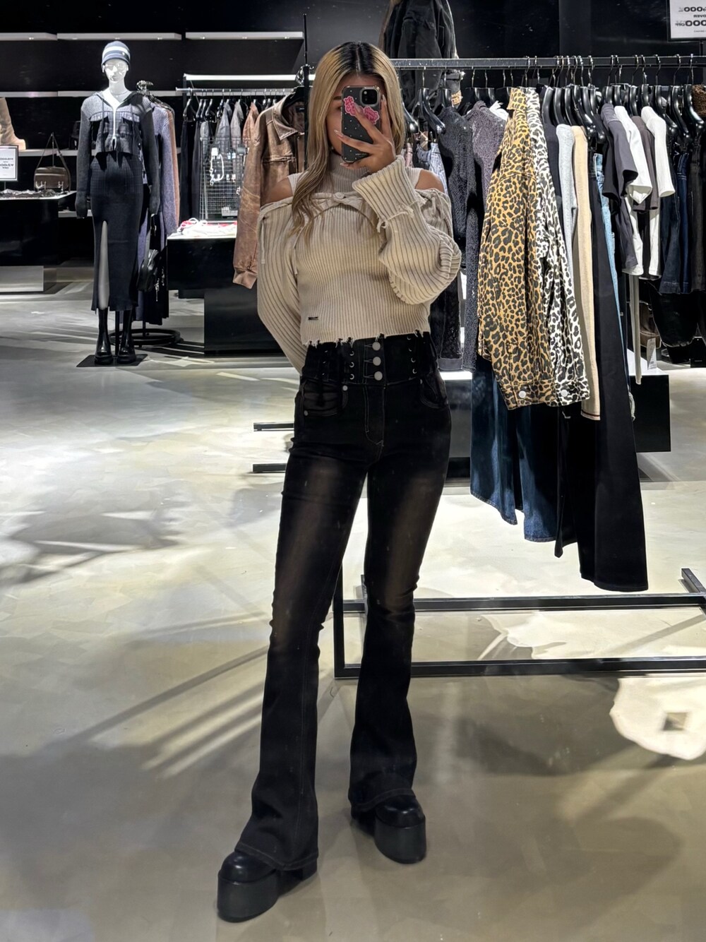 【トップス】 トレンドのフードデザインがポイントのレイヤードトップス💞オフショルにして少し肩を見せる着方がおすすめです💖インナーはシンプルなハイネックタンクで単品でも使いやすいです✨️ 【デニム】 大人気の-5キロデニム✨️スタイリングのポイントになるレースアップデザインはコルセットのようにウエストを細く見せてくれる効果もあります🪄広がりすぎないフレアシルエットで美脚効果も抜群です💖154cmでXS(0)サイズ着用です! 【ブーツ】 ラウンドトゥが女性らしい印象のブーツです🖤ヒールが約11センチで脚を長く綺麗に見せてくれますが、なおかつ傾斜もないので長時間歩いても疲れにくいです‼️23.5センチでMサイズ着用しております🦶🏻