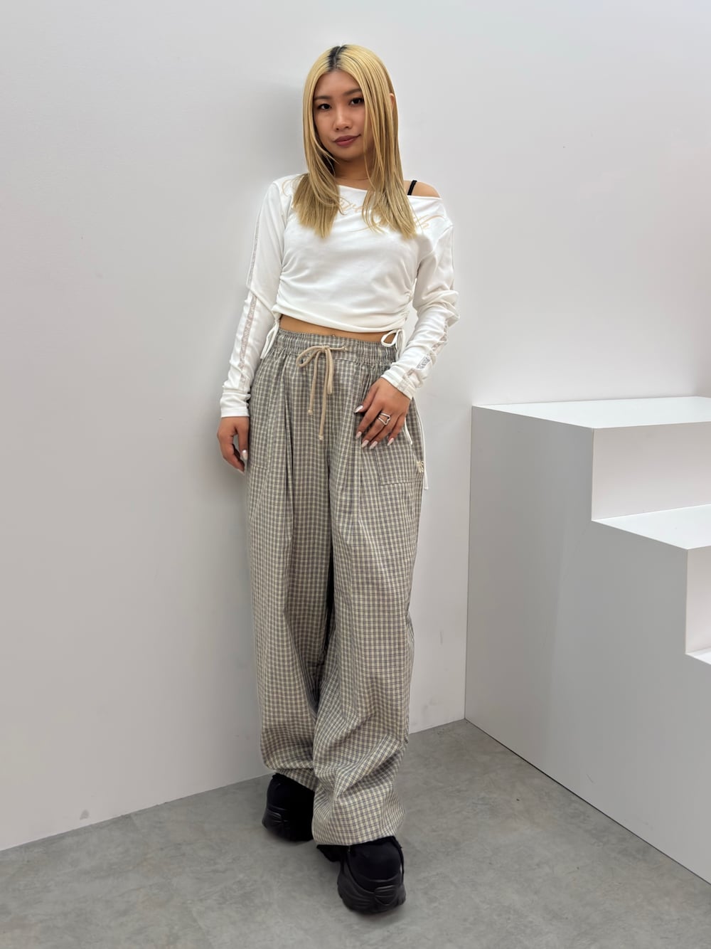 【トップス】 肩を落としてワンショルダーとして着ることができたり、サイドギャザーを絞ることで丈の長さを調節できるので、お好みの着こなしをしていただけます✨️袖のさり気ないレースラインもポイントです💞 【パンツ】 ウエストがゴム仕様なので楽に着ていただけます❗️しっかり太さのあるルーズなシルエットのパンツなので、ピタッとしたタイトなトップスと合わせるスタイリングがおすすめです✨️ 【スニーカー】 ボリュームのあるエアソールが長めのパンツでもミニスカート合わせでも存在感のある足元にしてくれます✨️約9センチのソールですが傾斜がなく、とても軽いのでたくさん歩いても疲れにくい設計になっています⭕️23.5センチでMサイズ着用です!