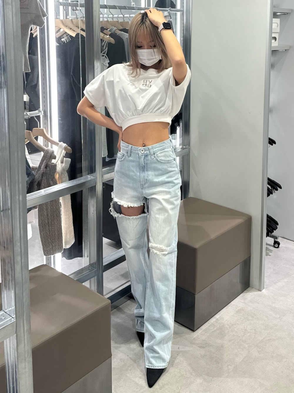 サマーコーデ❤︎ 《トップス》GYDAで毎年人気シリーズのトップスです!今年はスクエアロゴのデザインで登場致しました!二の腕が隠れてくれるので腕周りスッキリして見えます! 《ボトムス》GYDAらしいダメージデザインでインパクトのあるボトムスです❤︎今年はストレートパンツで丈は長めにお作りされているので脚長効果抜群です! 《シューズ》リブ素材のミュールです!定番デザインよりクッションが多く入っているので歩きやすく疲れにくくなっております!私は23.5cmでMサイズを着用しております!